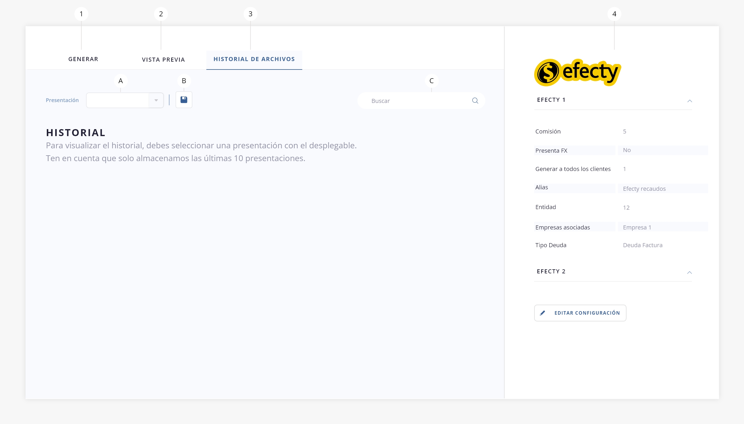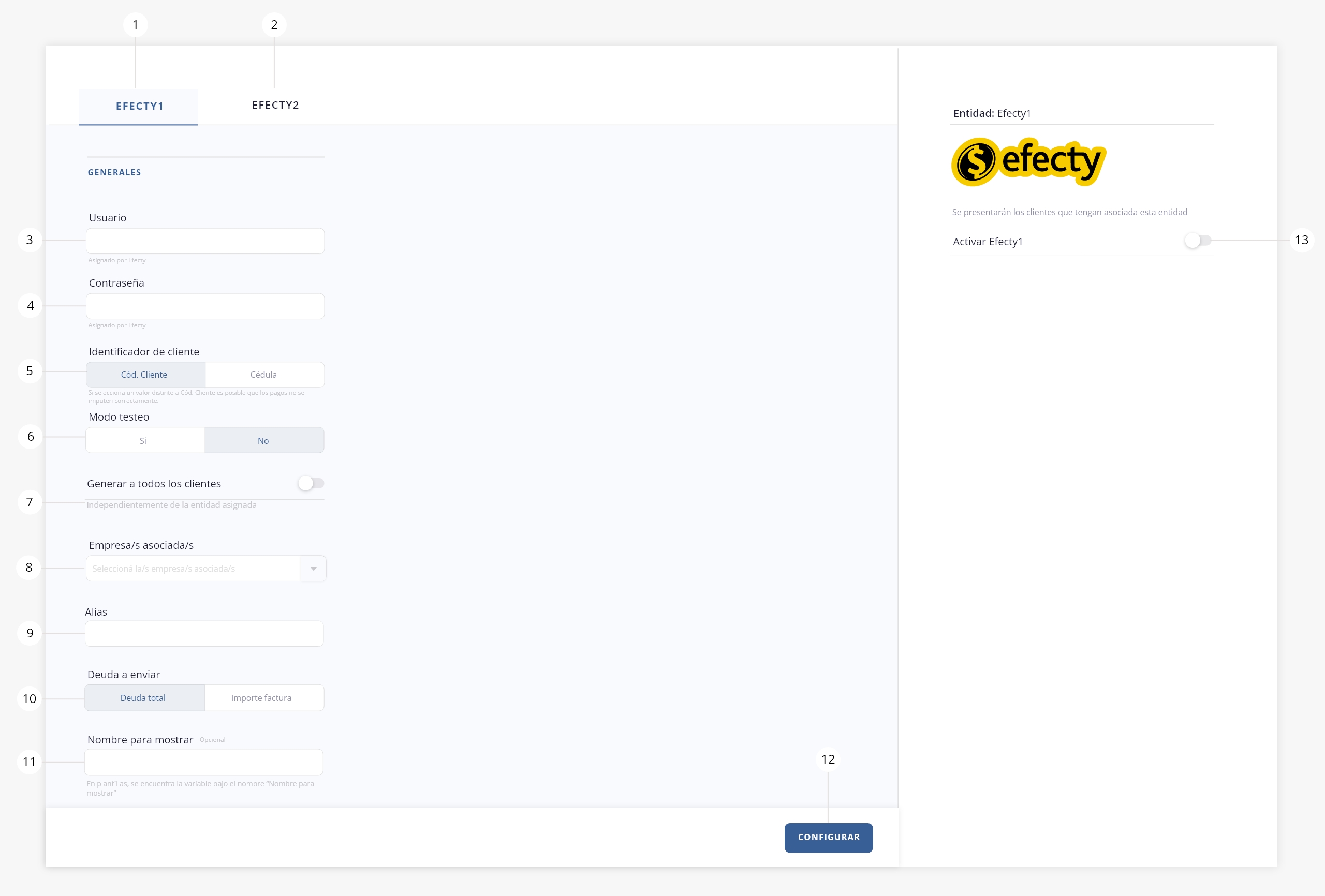 1) Efecty1. Tab disponible para configurar Efecty 1. Recuerda que tendrás disponibles tantos tabs como empresas tengas configuradas en ISPCube.
