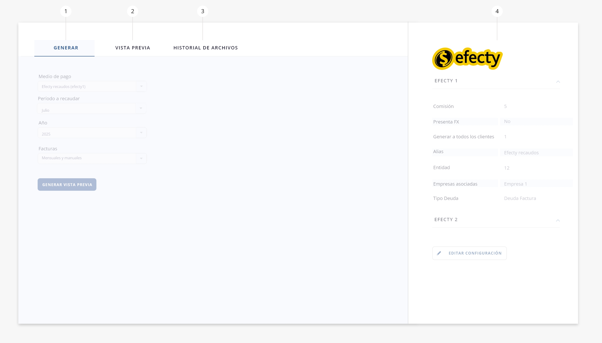 Después de completar los campos del tab «Generar», al presionar el botón «Generar vista previa» accederás a una previsualización de los elementos que se enviarán a Efecty.
