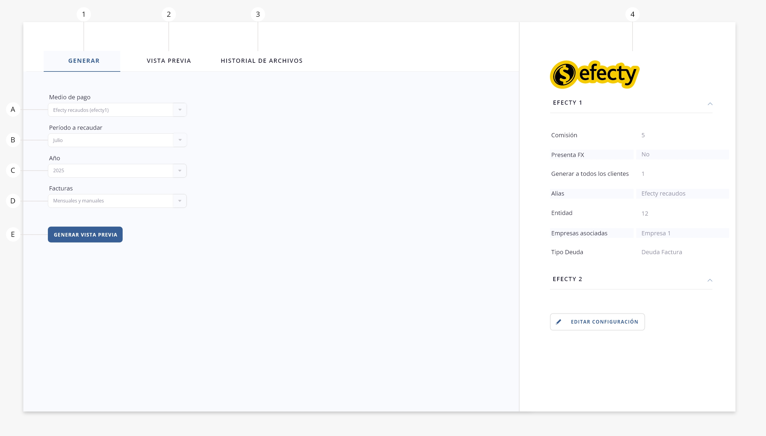 - a. Medio de pago. Selecciona sobre cuál de las entidades configuradas (Efecty 1, 2, 3, 4 y 5), deseas operar.