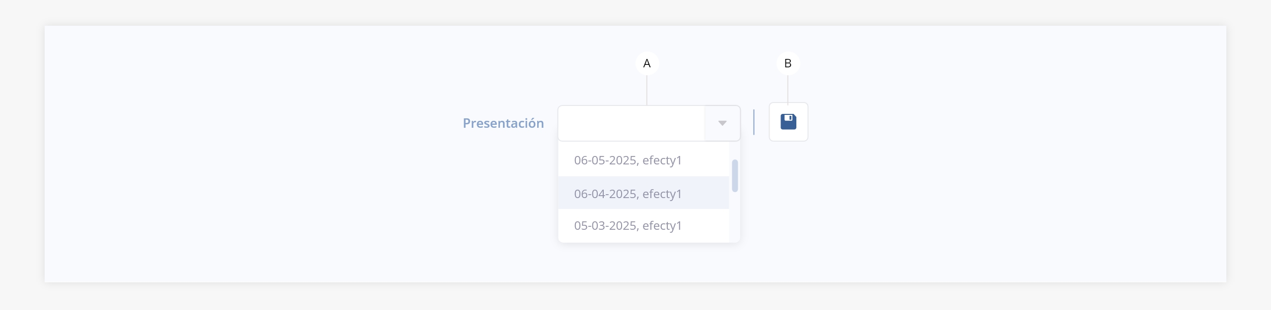 Una vez que realices la selección filtrarán todos los elementos relacionados a esta presentación puntual. Ten en cuenta que almacenamos las últimas 10 presentaciones, de todas maneras podrás exportar las mismas mediante el punto «b».