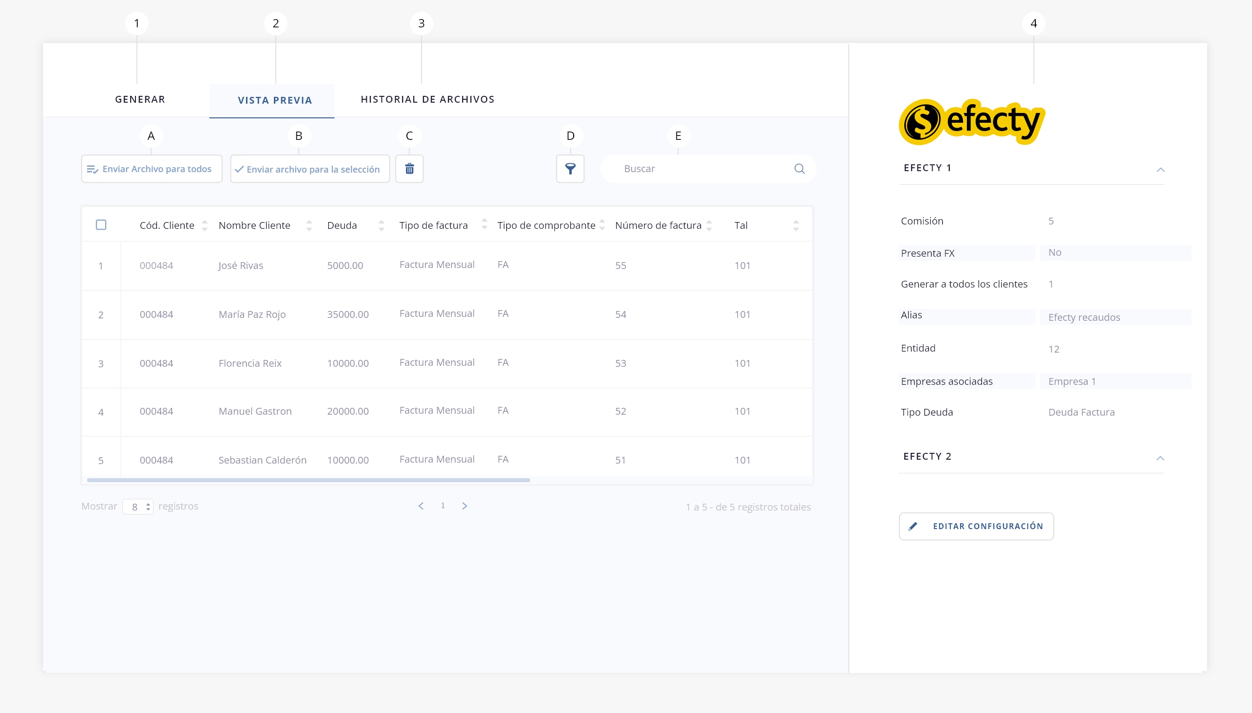 En este tab vas a poder definir y configurar las deudas a presentar a Efecty. Una vez que definas los parámetros, tendrás acceso a una vista previa de los registros a enviar: