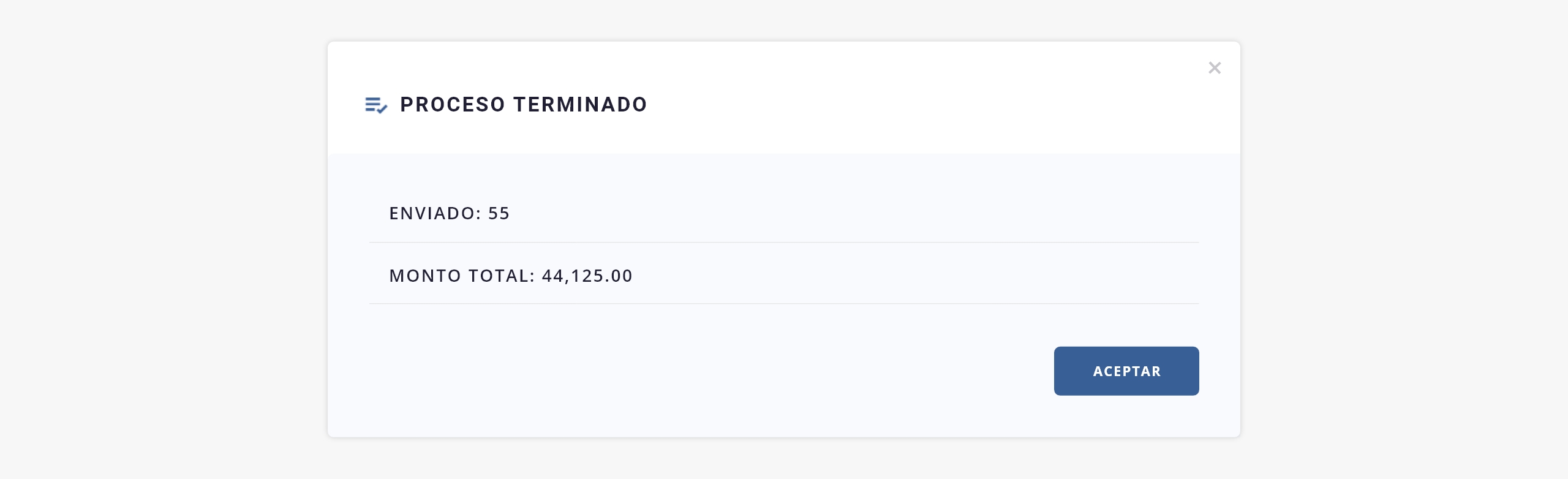 Una vez que envíes a Efecty los registros utilizando cualquiera de las dos opciones anteriormente mencionadas, visualizarás el siguiente modal, donde se mostrarán la cantidad de clientes enviados, y el total a recaudar: