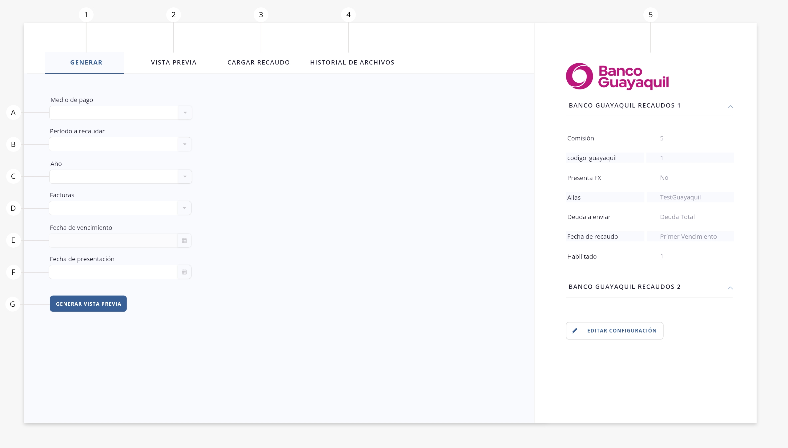 Sobre esta columna veremos un resumen de la configuración de Banco Guayaquil Recaudos: