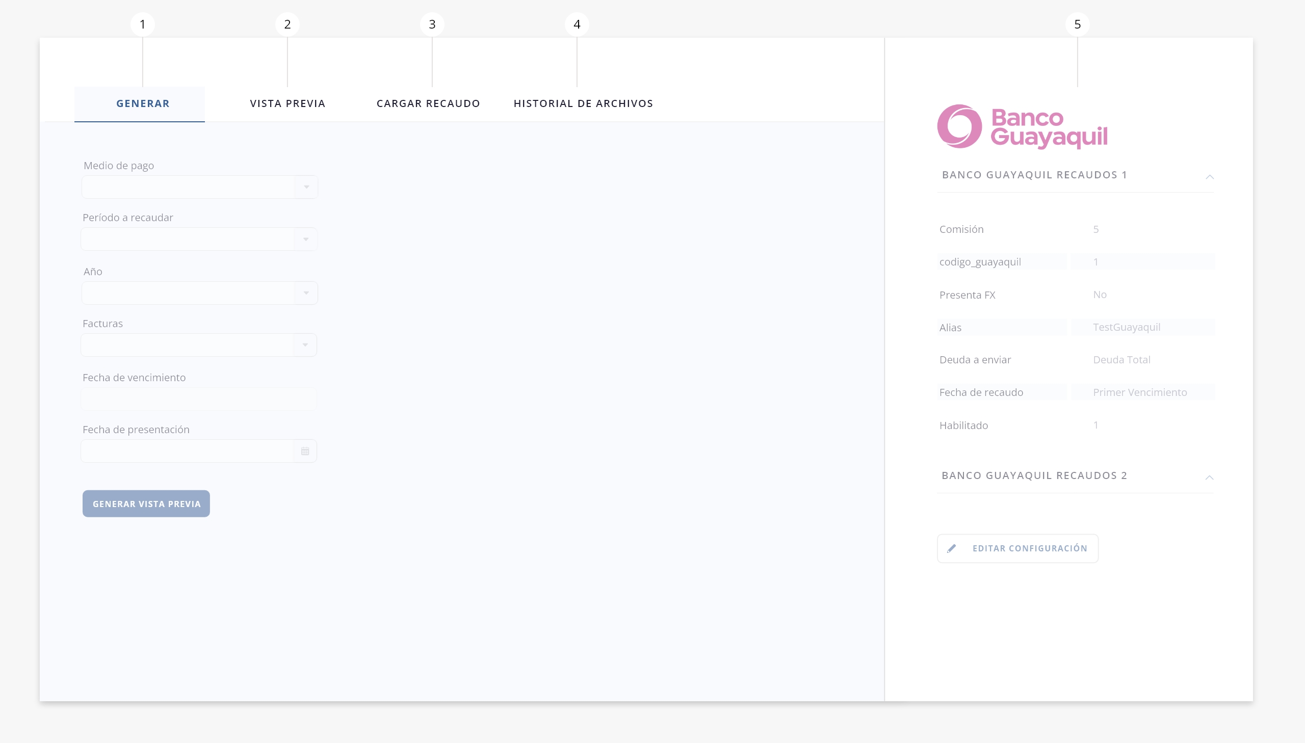 Después de completar los campos del tab ‘Generar’ (inciso 1), al presionar el botón «Generar vista previa», accederás a una previsualización de los elementos que se presentarán a Banco Guayaquil: