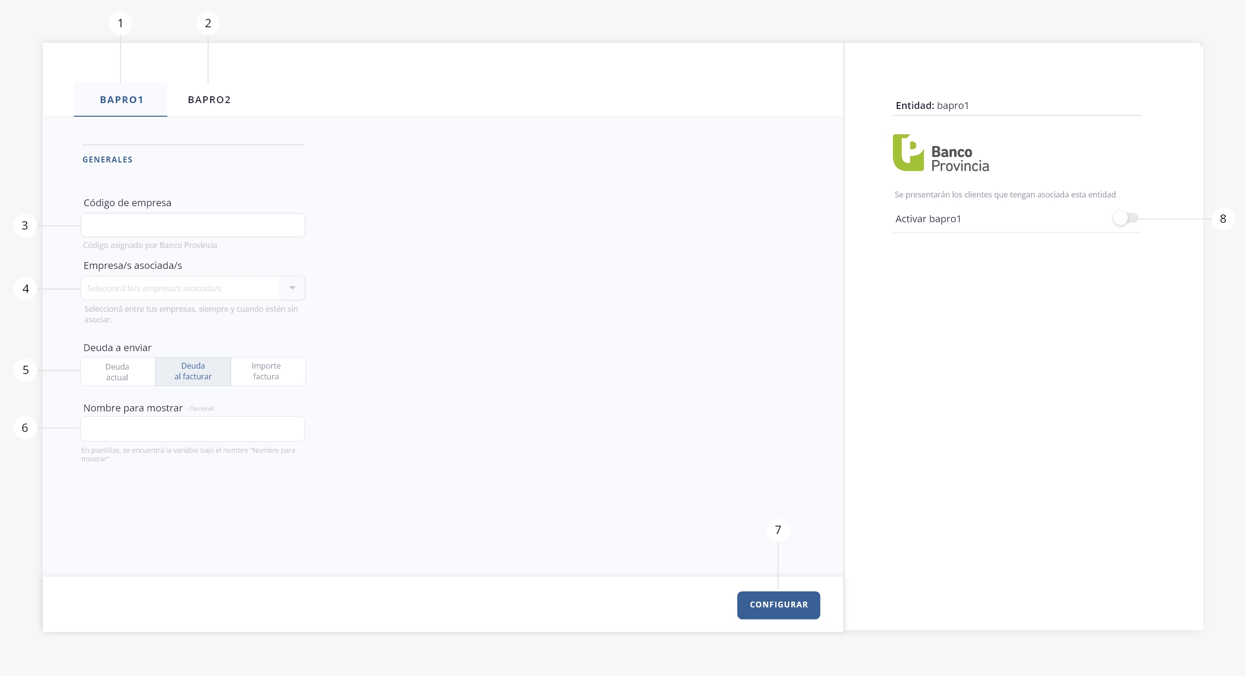 Al completar y guardar la información del formulario, no te olvides de activar el switch «Activar BaPro 1» (inciso 8) para poder comenzar a utilizarlo.