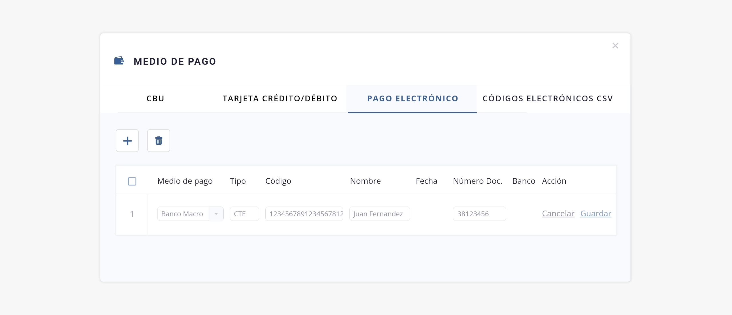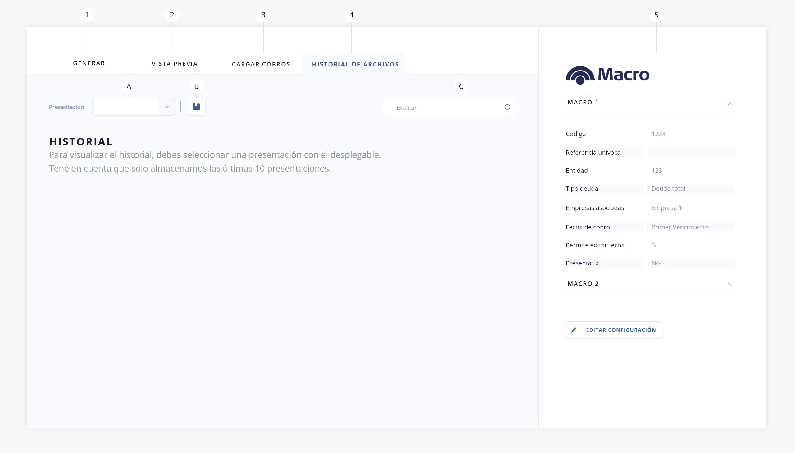 - a. Medio de pago. Seleccioná sobre que entidad de las que tengas configuradas (Macro 1, 2, 3, 4 o 5) deseás operar.