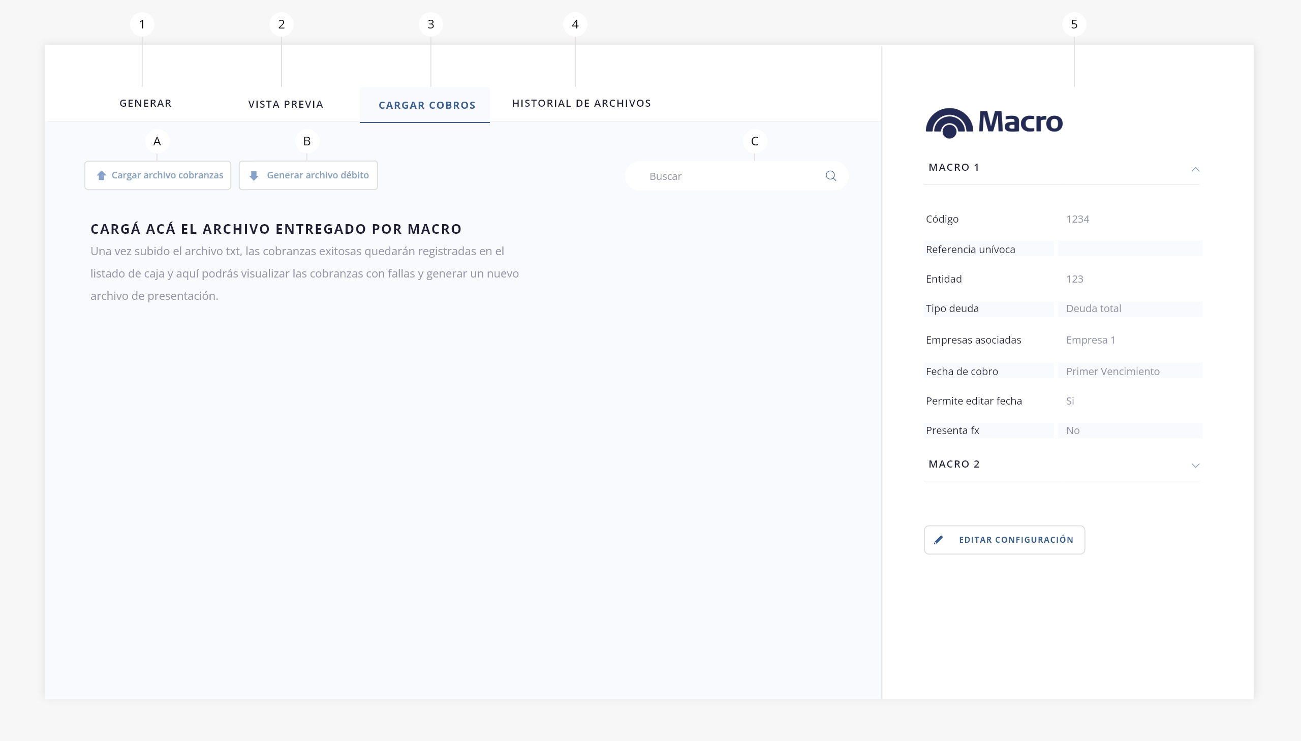 - a. Cargar archivo. Subí acá el archivo con las conformaciones o rechazos de los débitos proporcionado por Banco Macro.