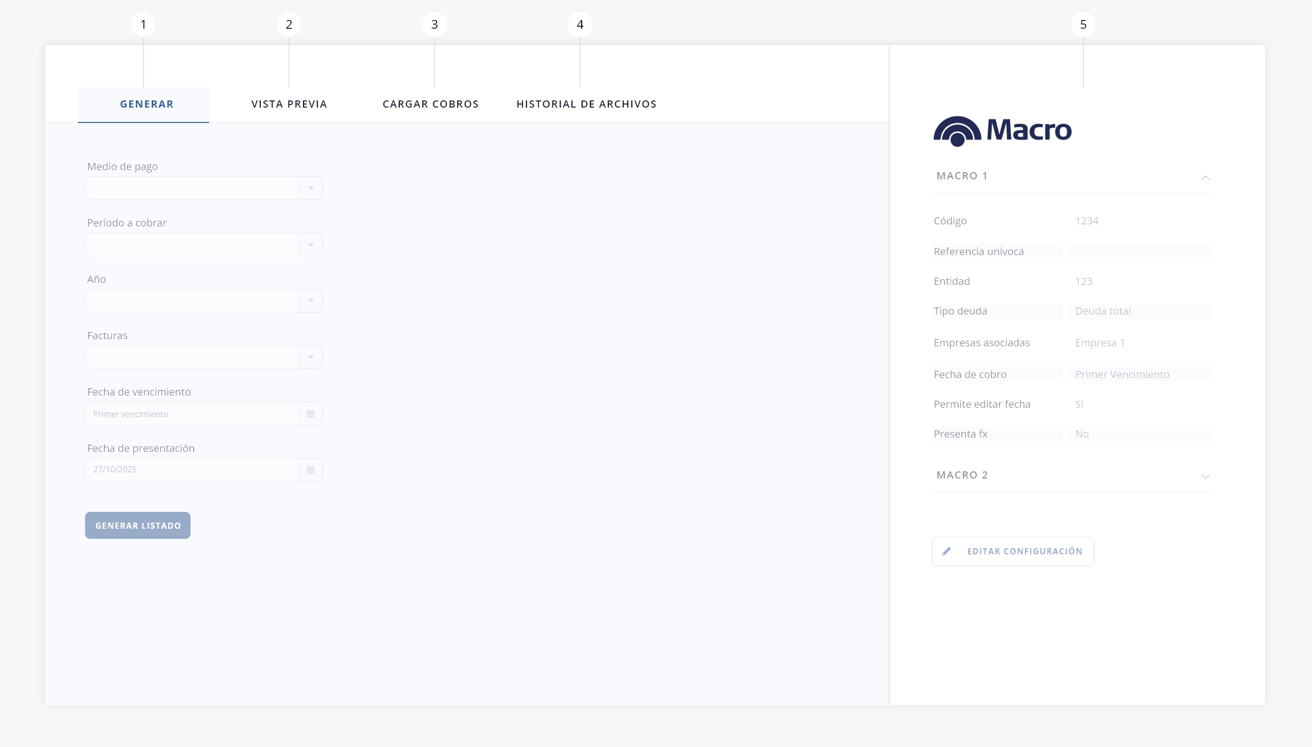 - g. Generar listado. Una vez configurados todos los campos anteriores, estarás en condiciones de generar el listado de deudas a presentar a Banco Macro. Serás direccionado a una vista previa descripta en el siguiente punto.