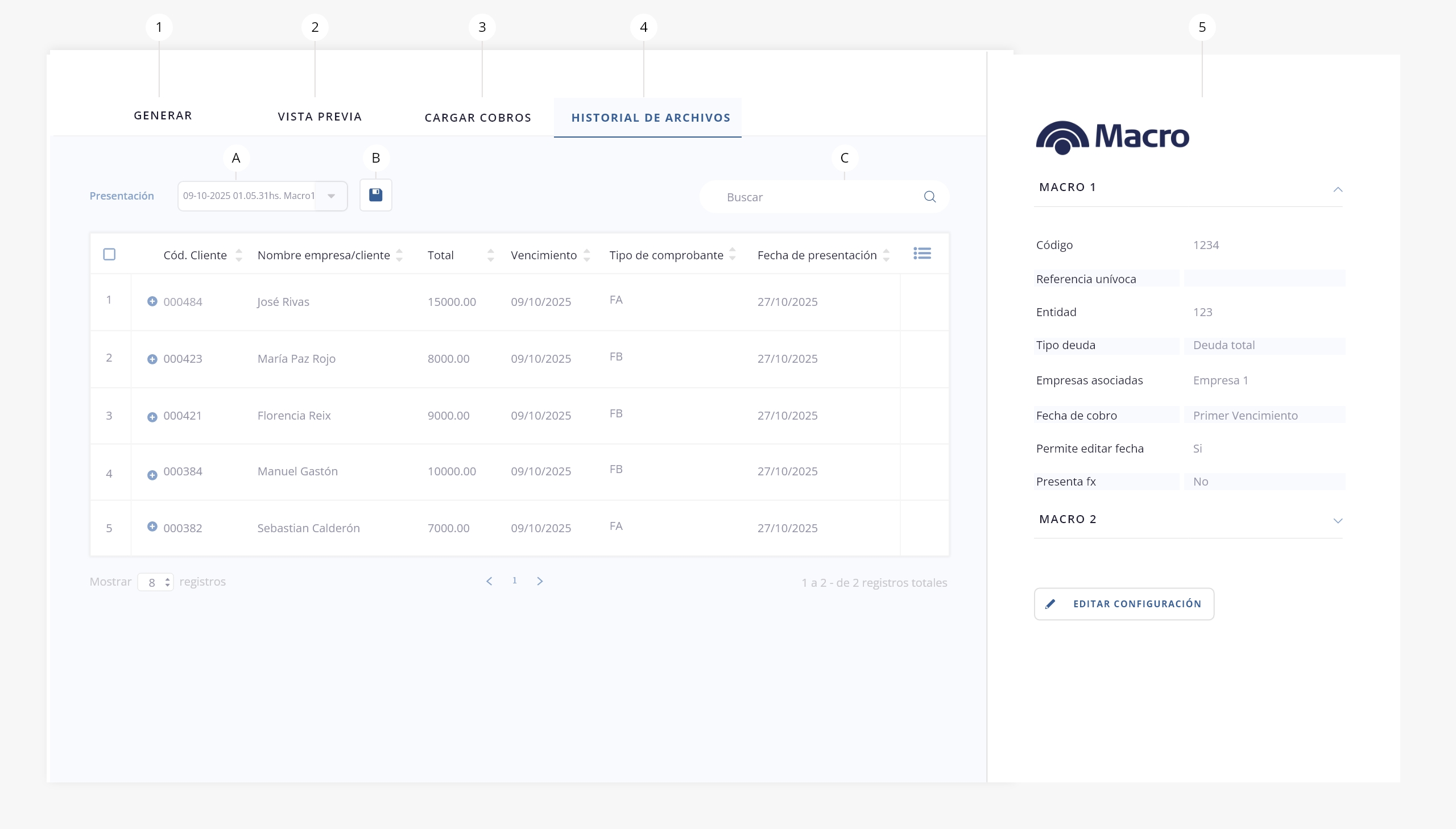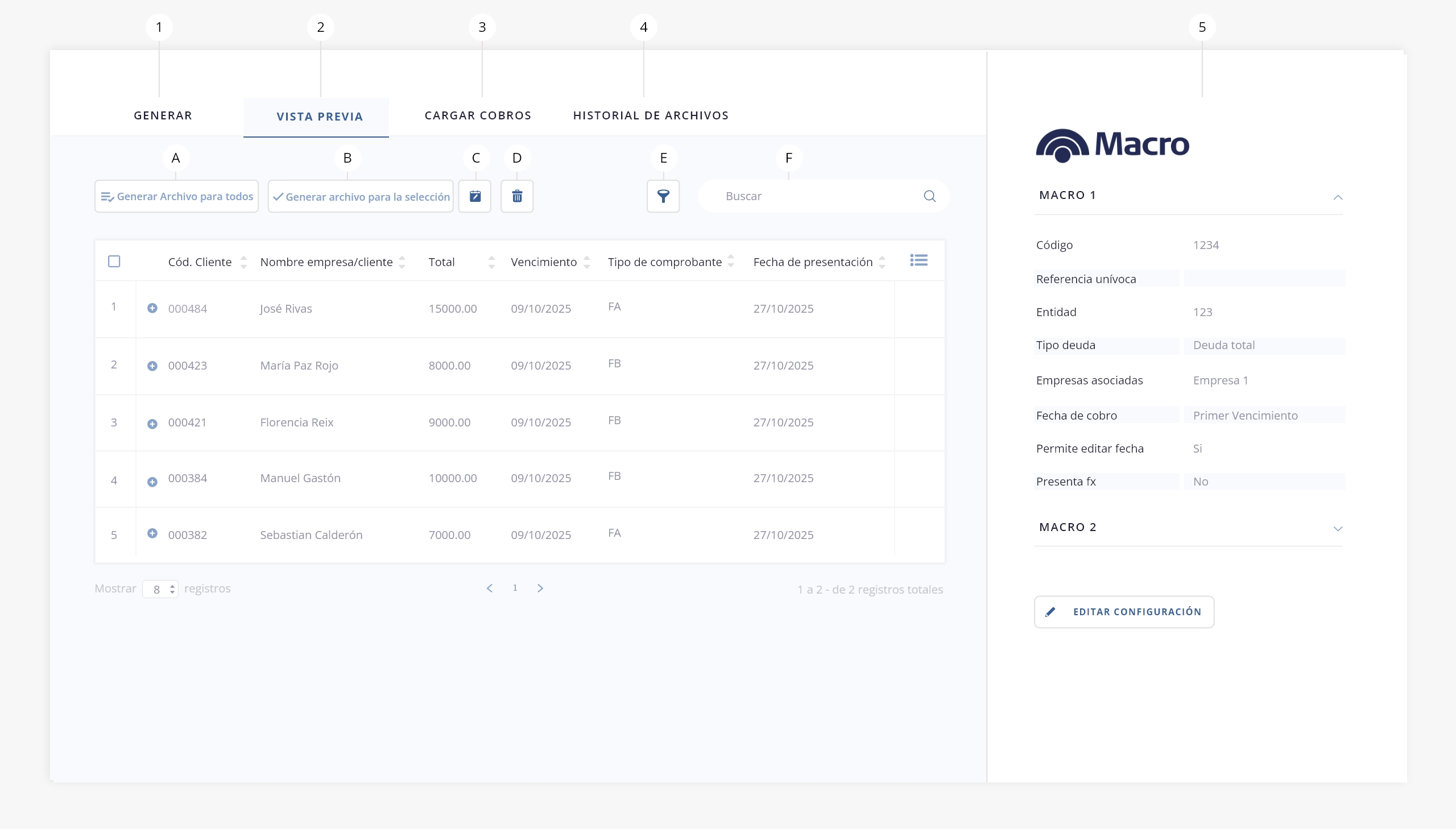 Este apartado te permite configurar y generar una vista previa de todos los registros que serán presentados a Banco Macro: