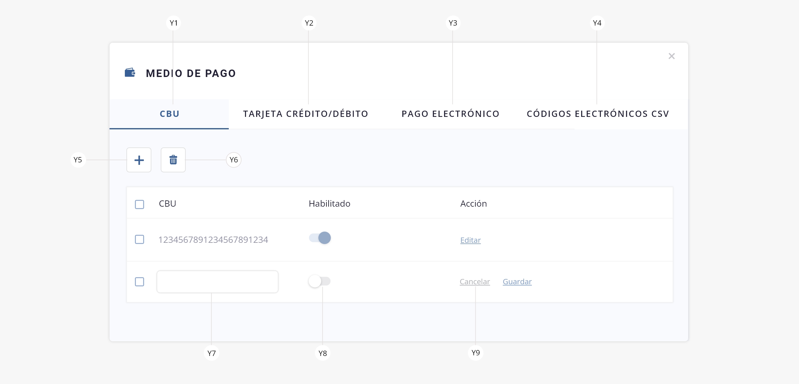 y1) CBU. Tab destinado a la carga/edición de los CBU del cliente.