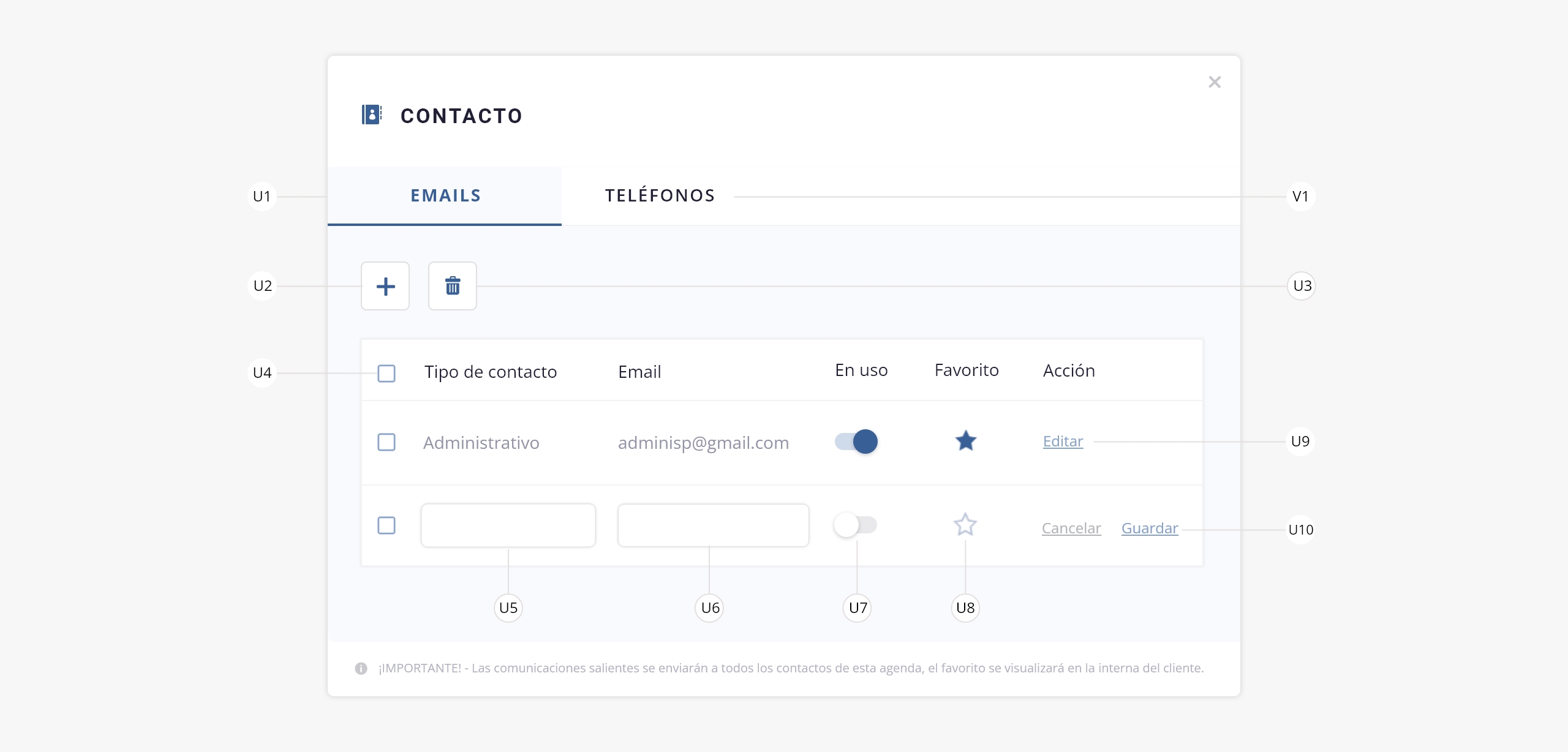 u8) Favorito: permite marcar un correo del cliente como destacado. Ten en cuenta que las comunicaciones salientes igualmente se enviarán a todos los correos configurados en la agenda de emails; esta función solo resalta uno de ellos.