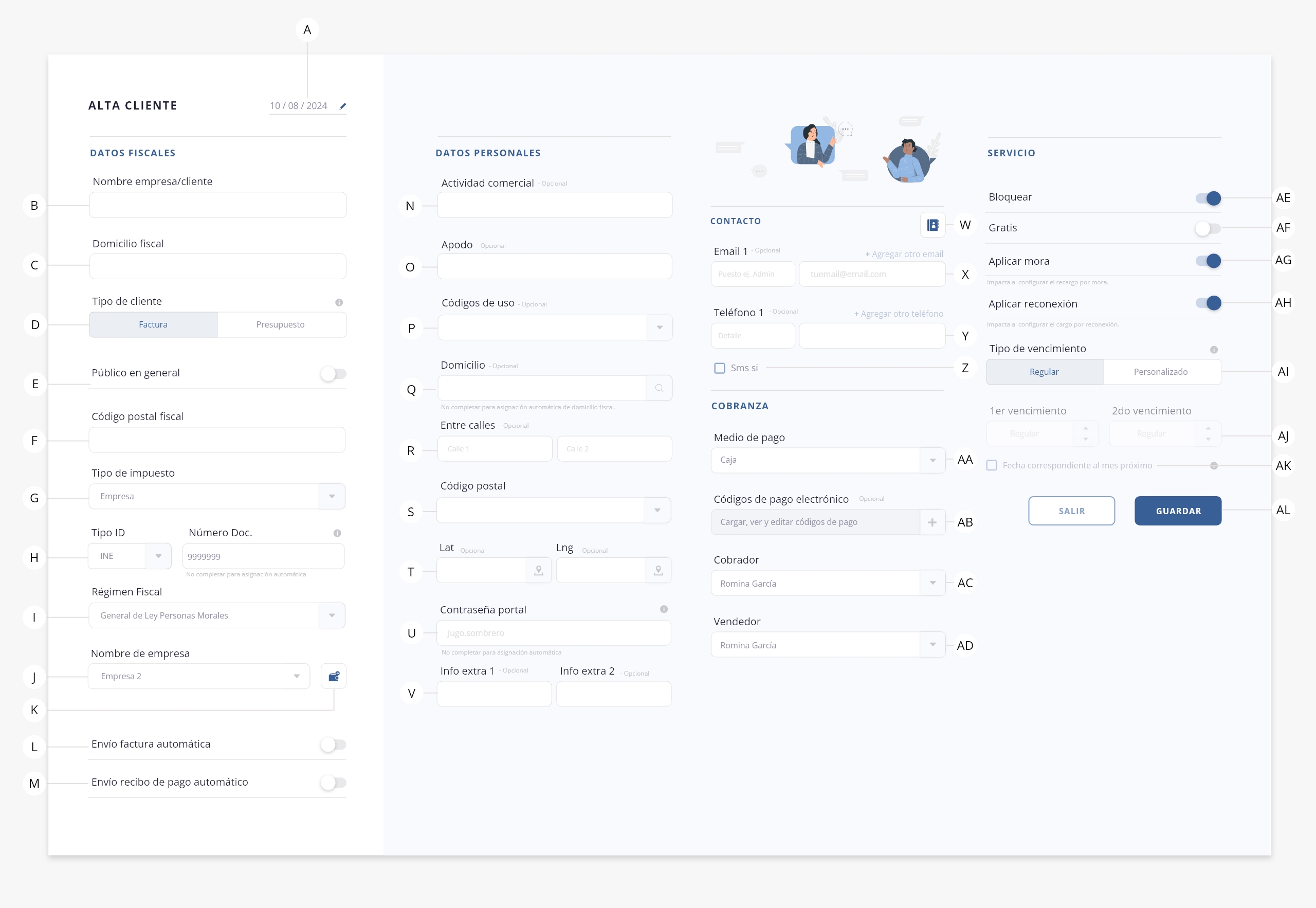 - a. Fecha de alta. Al momento de dar de alta un cliente, notarás que la fecha de alta se completa automáticamente. Podrás editar la fecha en caso de ser necesario.