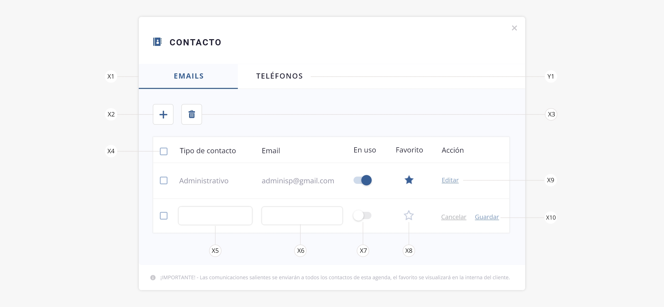 x8) Favorito: permite marcar un correo del cliente como destacado. Ten en cuenta que las comunicaciones salientes igualmente se enviarán a todos los correos configurados en la agenda de emails; esta función solo resalta uno de ellos.