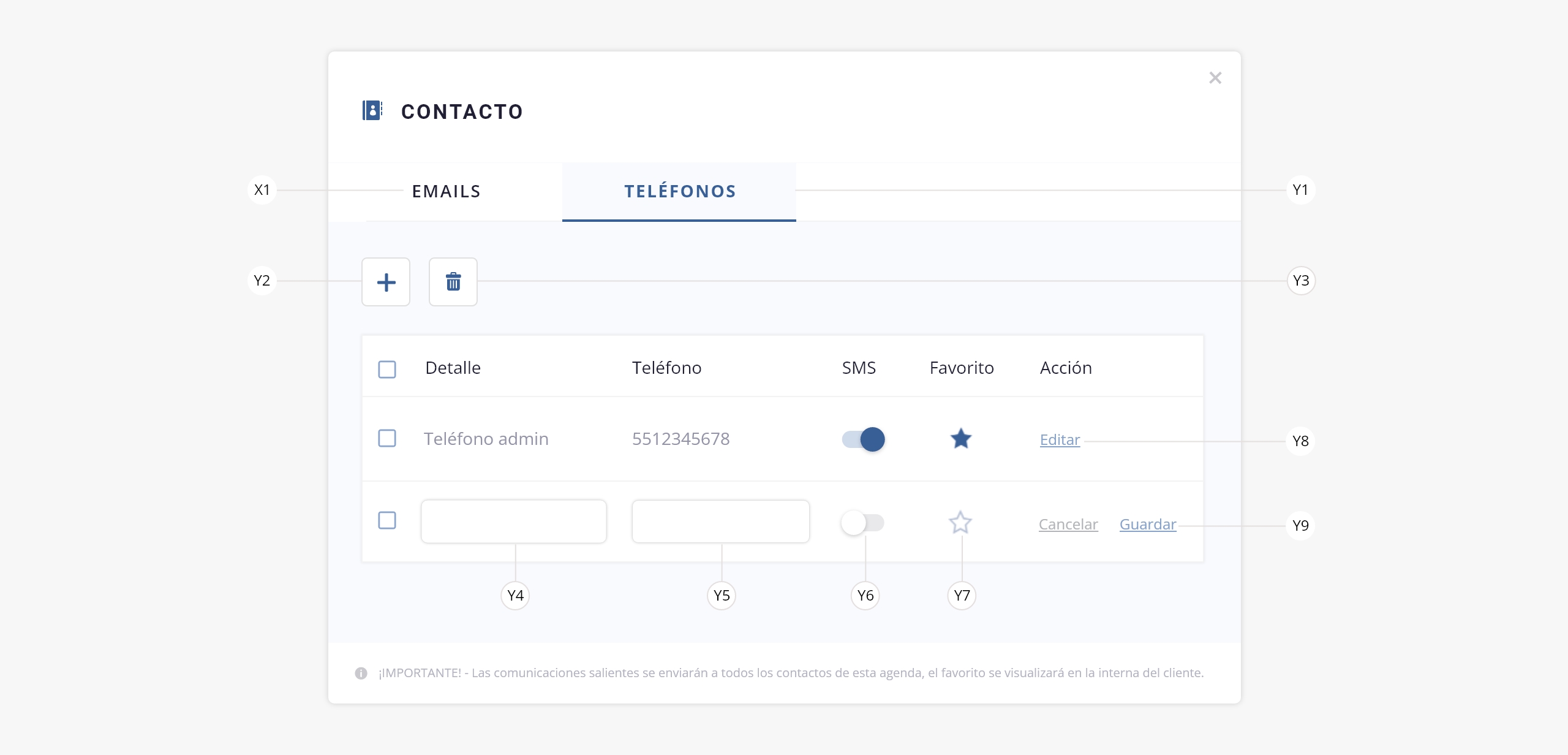 y7) Favorito: al marcar un teléfono como favorito, este se destacará y se mostrará en el panel lateral de la interna del cliente. Ten en cuenta que las comunicaciones salientes igualmente se enviarán a todos los teléfonos configurados en la agenda; esta función solo resalta uno de ellos.