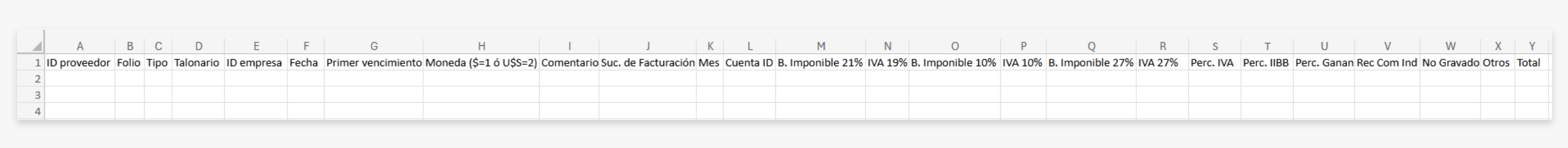 Al descargarla, obtendrás un archivo en formato .XLS con varias columnas que deberás completar para importar las facturas. Además, el archivo incluye tres pestañas con los IDs de registros ya cargados en el sistema (proveedores, empresas y cuentas), que deberás utilizar al momento de completar la información.