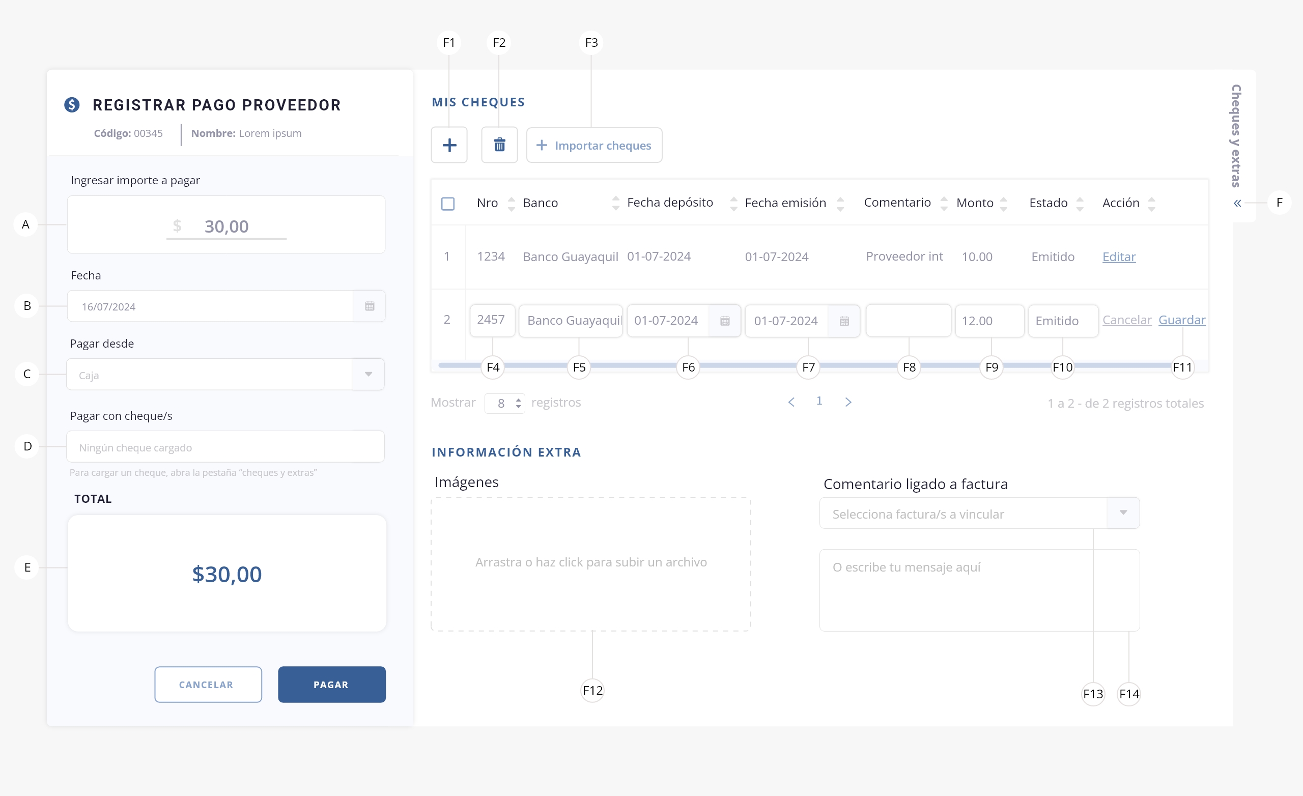 f13) Comentario ligado a factura. En caso de tener facturas a nombre de este proveedor, podrás seleccionar y asociar facturas al pago.