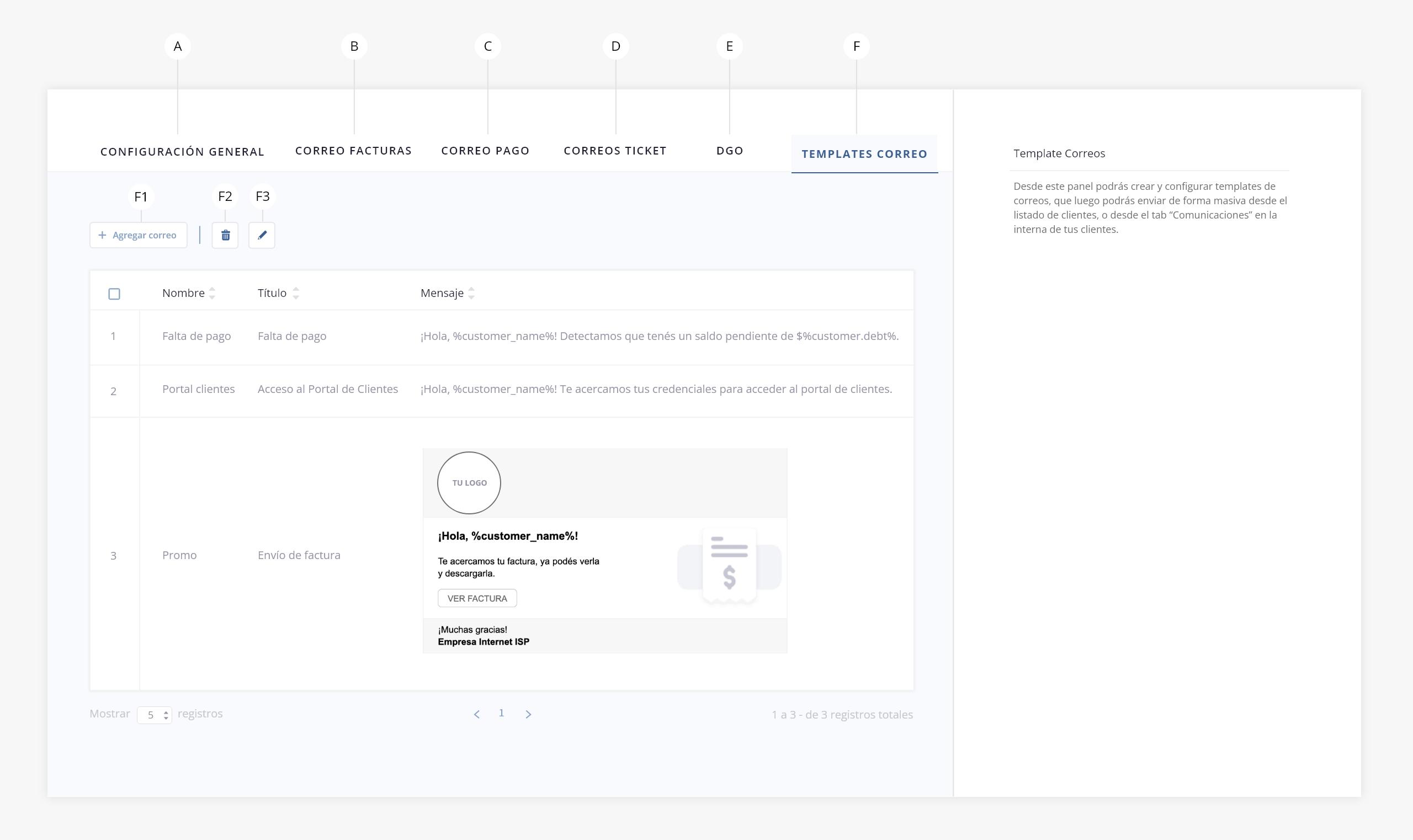 - f. Template correos. En este tab vas a encontrar un listado donde se almacenan todos los templates/plantillas de tus correos.