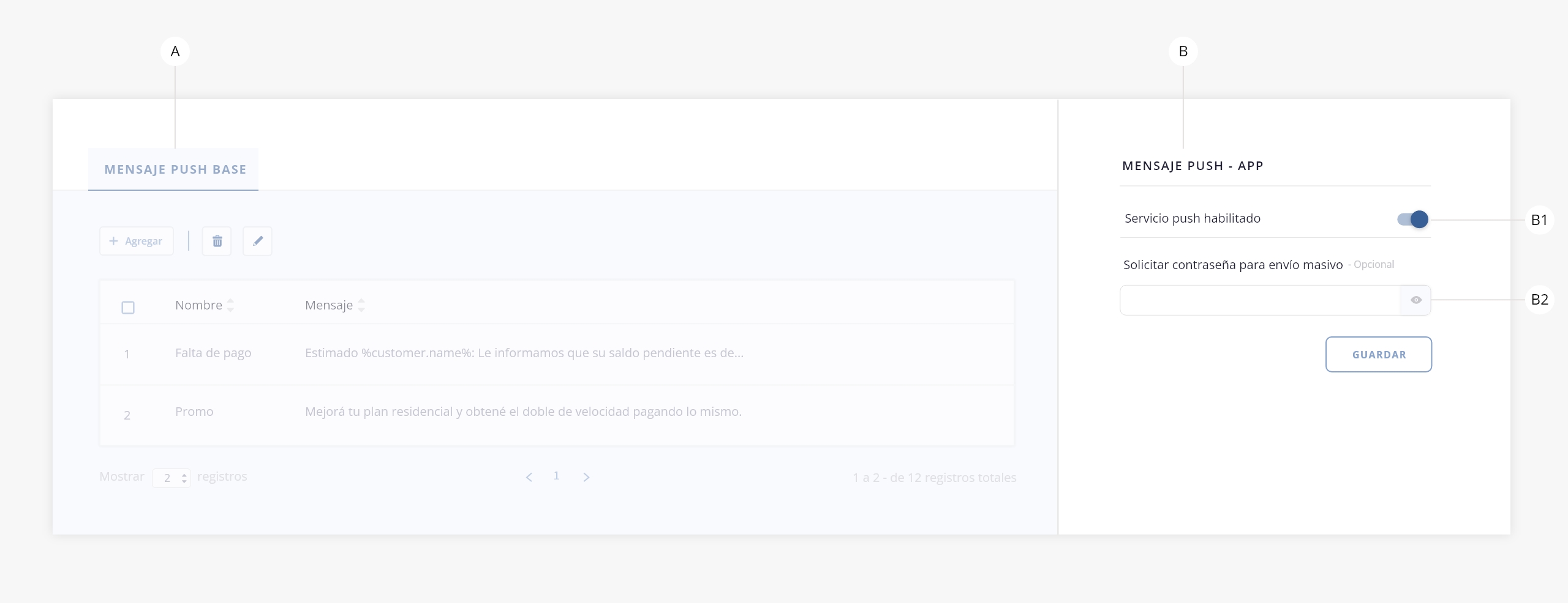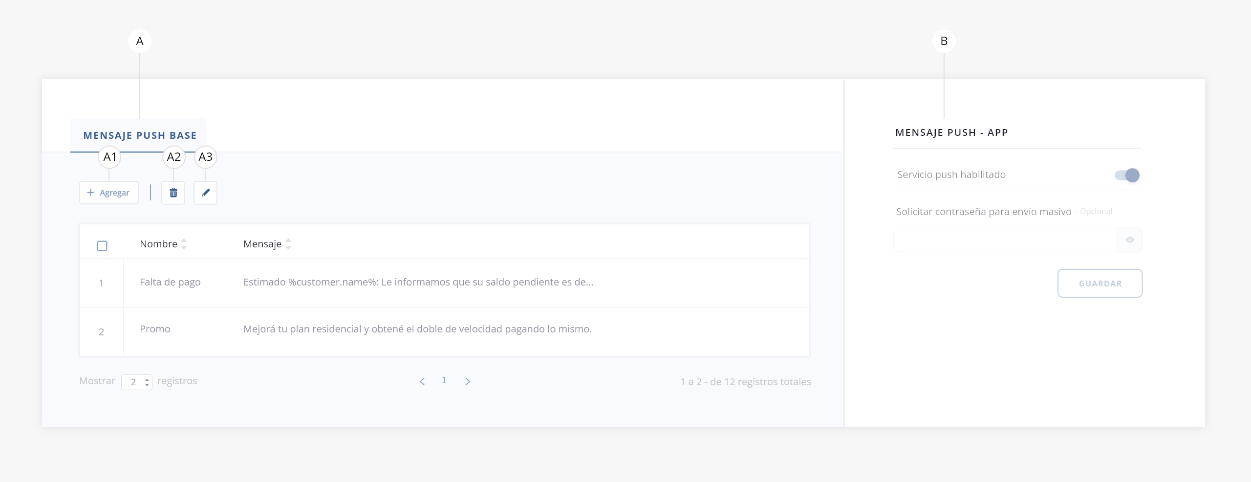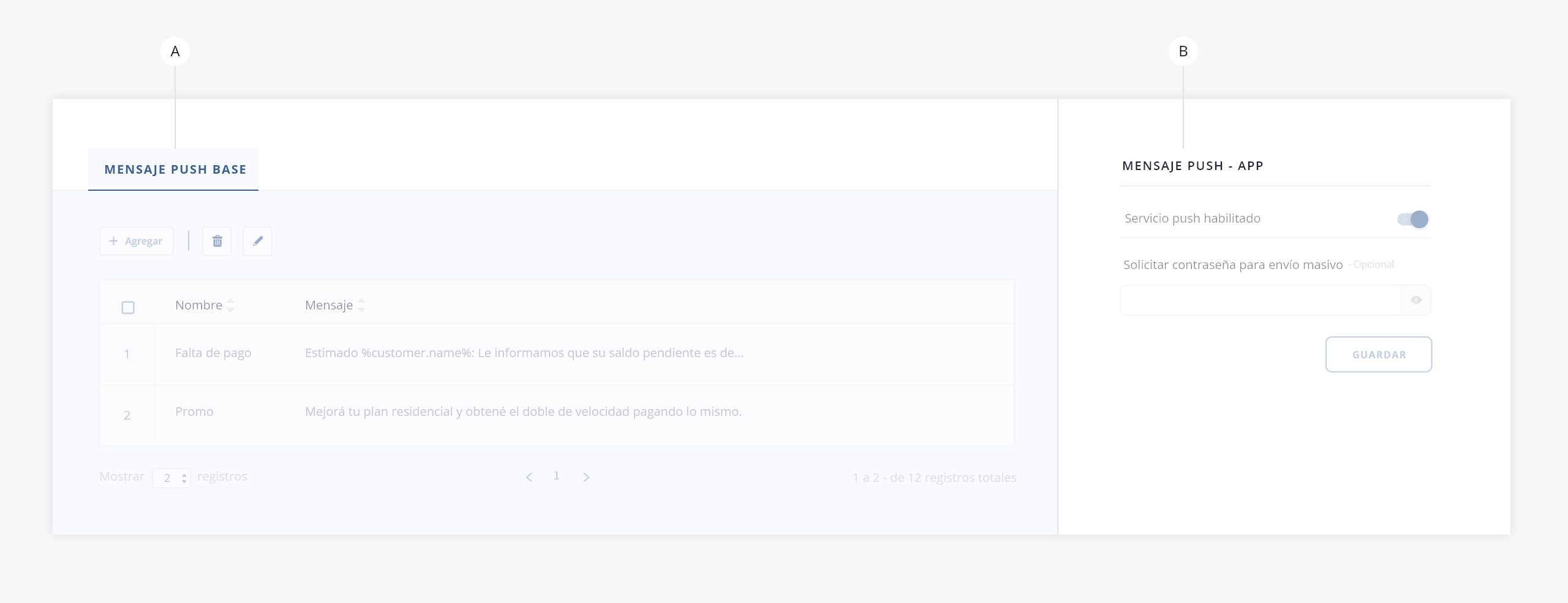 - a. Mensajes push base. Desde este panel podrás configurar y guardar plantillas de mensajes push predefinidos.