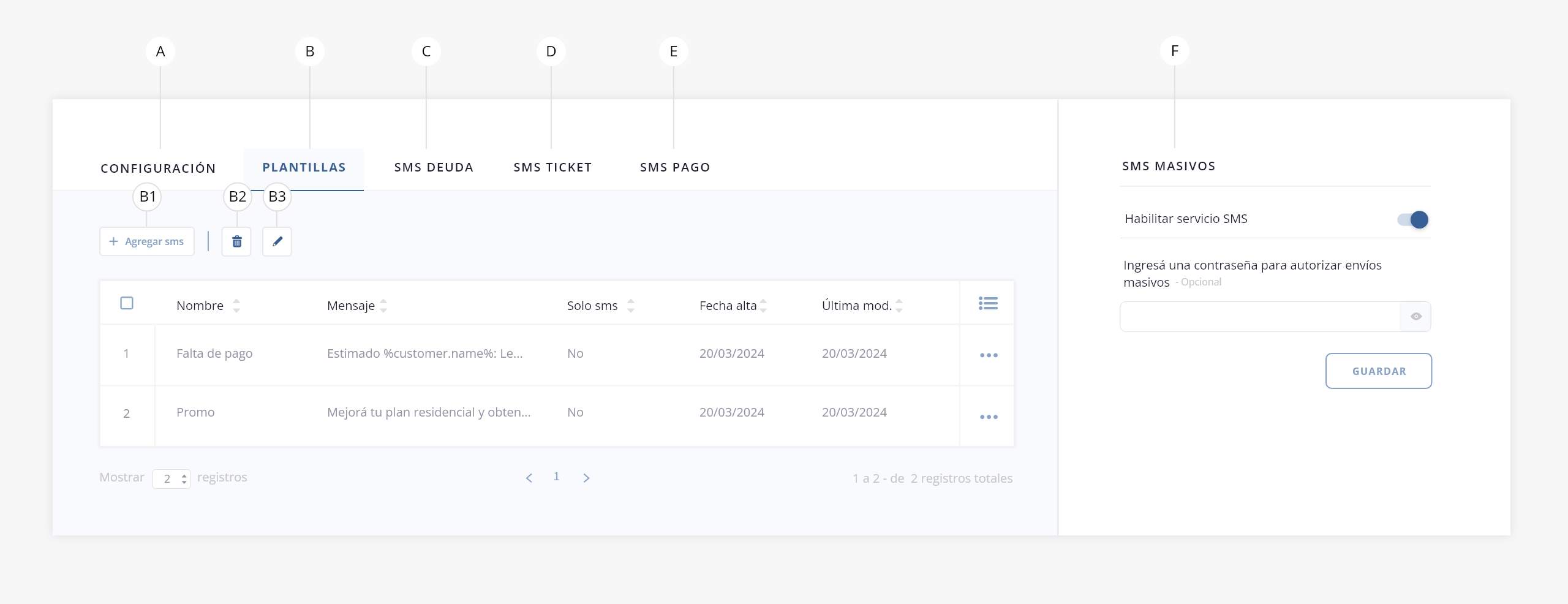 - f. SMS Masivos. Mediante este panel lateral, podrás habilitar el servicio de SMS configurado y definir una contraseña para el envío de los mismos.