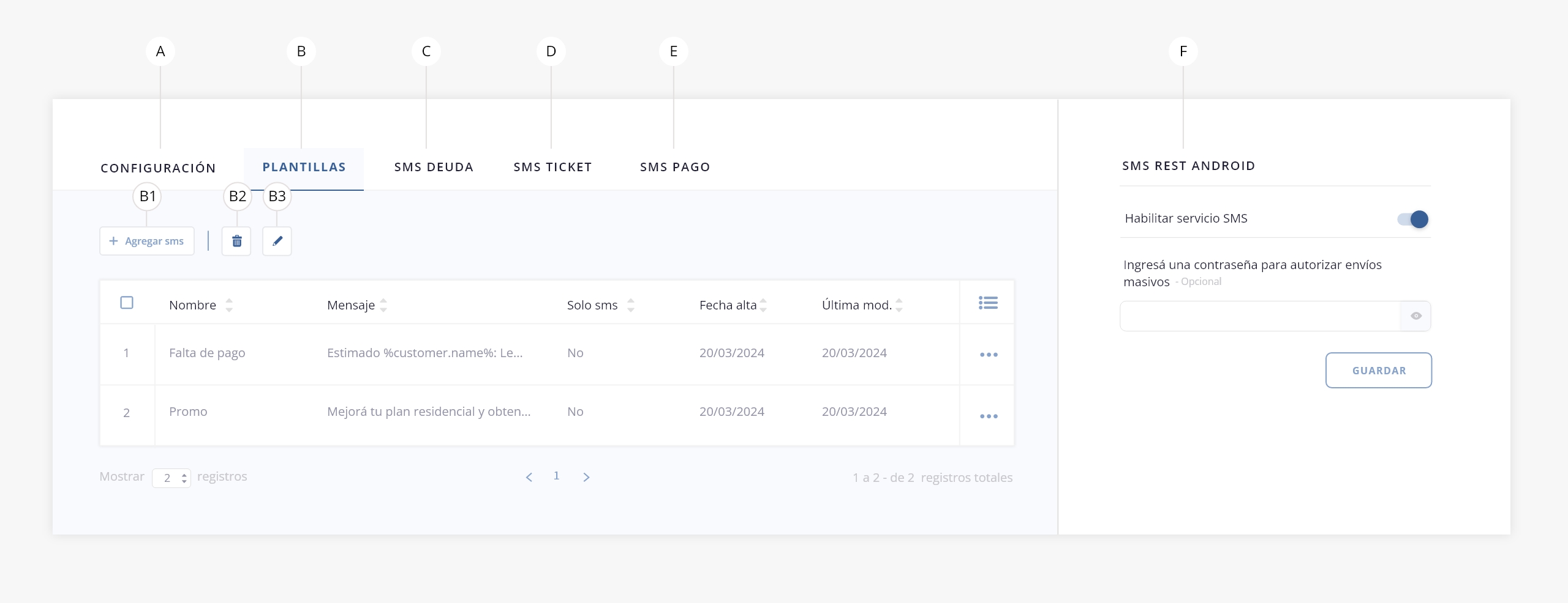 - a. Configuración. Si contás con el servicio de SMS Rest Android, podés realizar la configuración del mismo desde este panel.