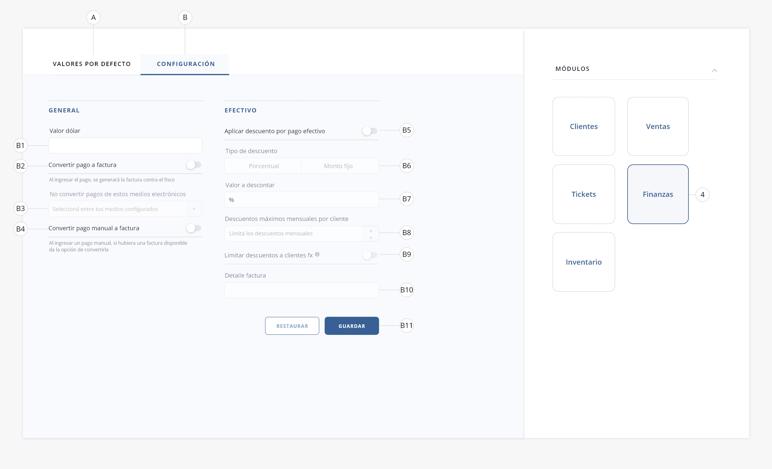 - d. Factura electrónica. Activá este switch para permitirle al sistema emitir facturas electrónicas. De lo contrario el sistema permitirá facturar únicamente mediante ‘FX’.