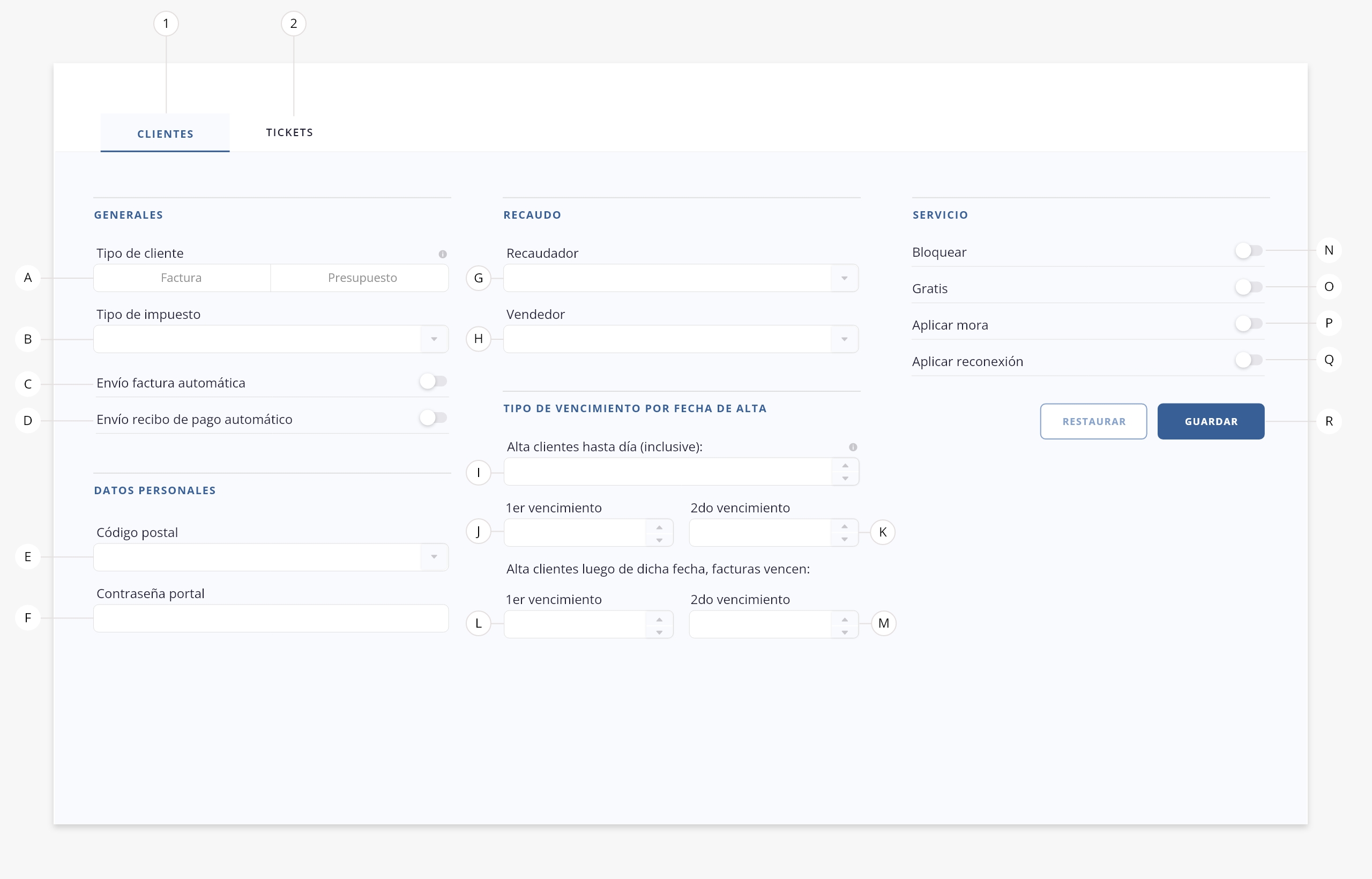 - n. Bloquear. Si activas este switch, al crear un cliente, el switch «Bloquear» aparecerá activo por defecto.