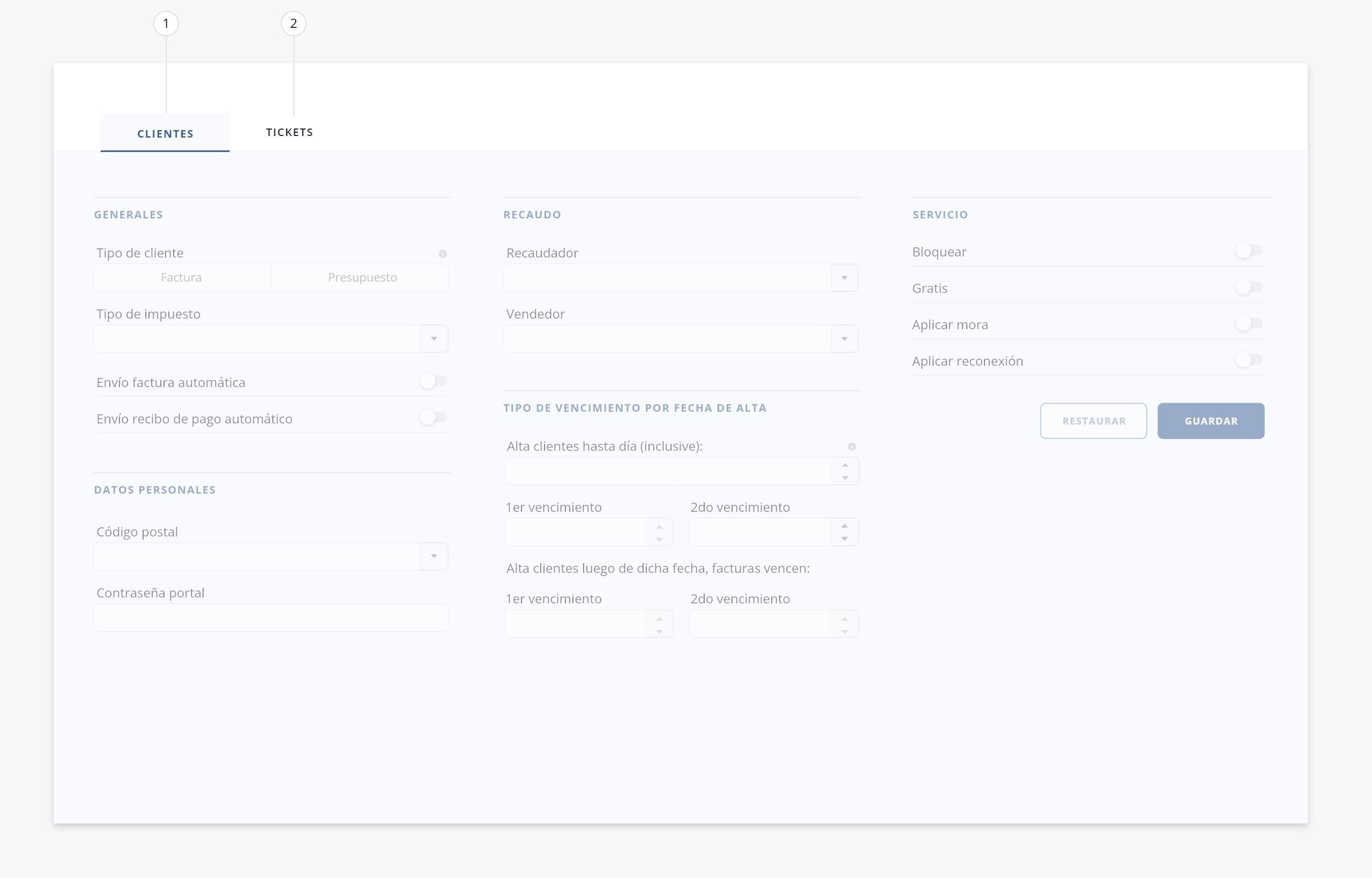 En esta sección vas a poder configurar valores por defecto que se aplican automáticamente en los módulos Clientes y Tickets. Estos valores se completarán automáticamente en los formularios según la configuración definida en esta sección, con la opción de editarlos luego en los formularios correspondientes.Por ejemplo, si en este formulario defines “Factura” en el campo Tipo de cliente, al crear un nuevo cliente ese valor aparecerá por defecto, aunque podrás modificarlo según corresponda.