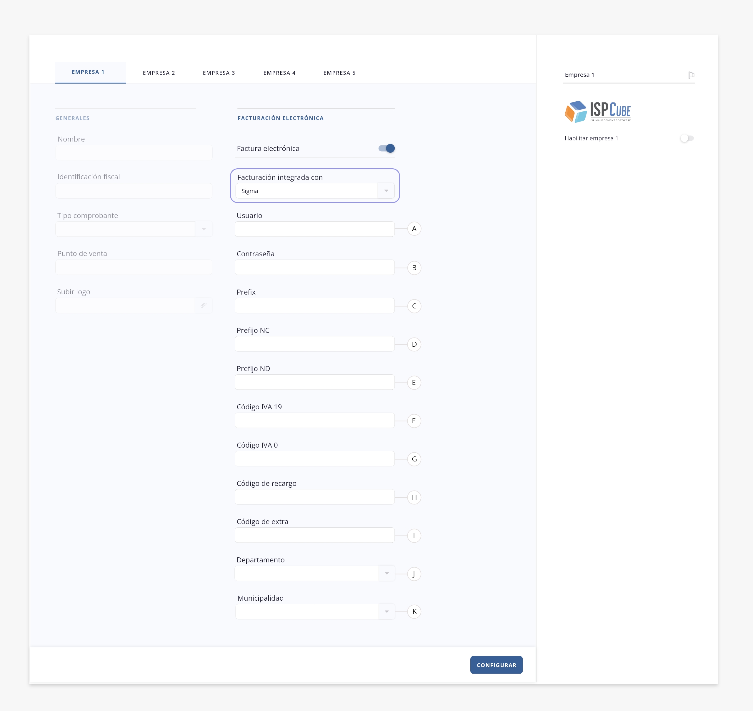 - a. Nombre de la empresa. Define aquí la razón social propietaria de la licencia de ISPCube.