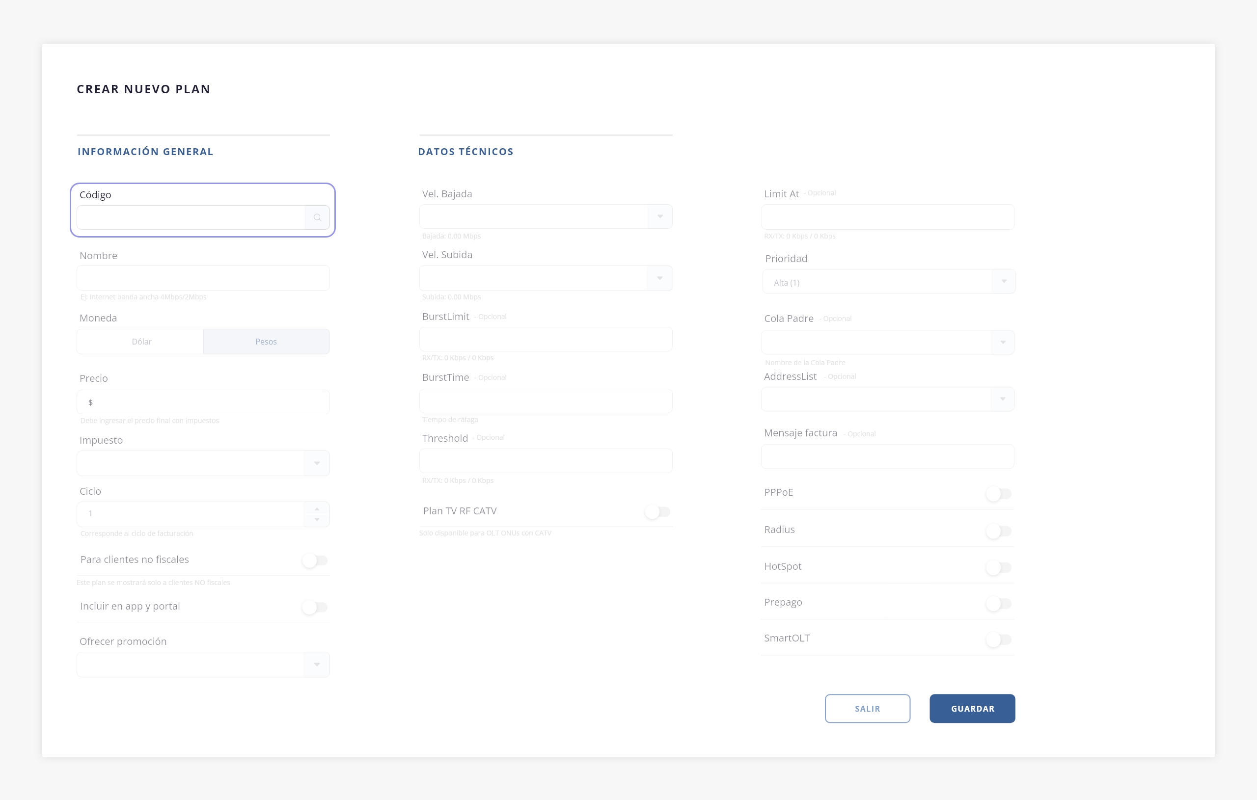 - q. Mostrar planes según tipo de cliente. Si activas este switch, se habilitará un nuevo switch en el formulario de creación o edición de planes. Ese switch te permitirá definir que el plan sea visible —al momento de crear una conexión— únicamente para clientes tipo presupuesto. Para más información, dirígete al punto «1.g» de «Gestión de red > Planes».