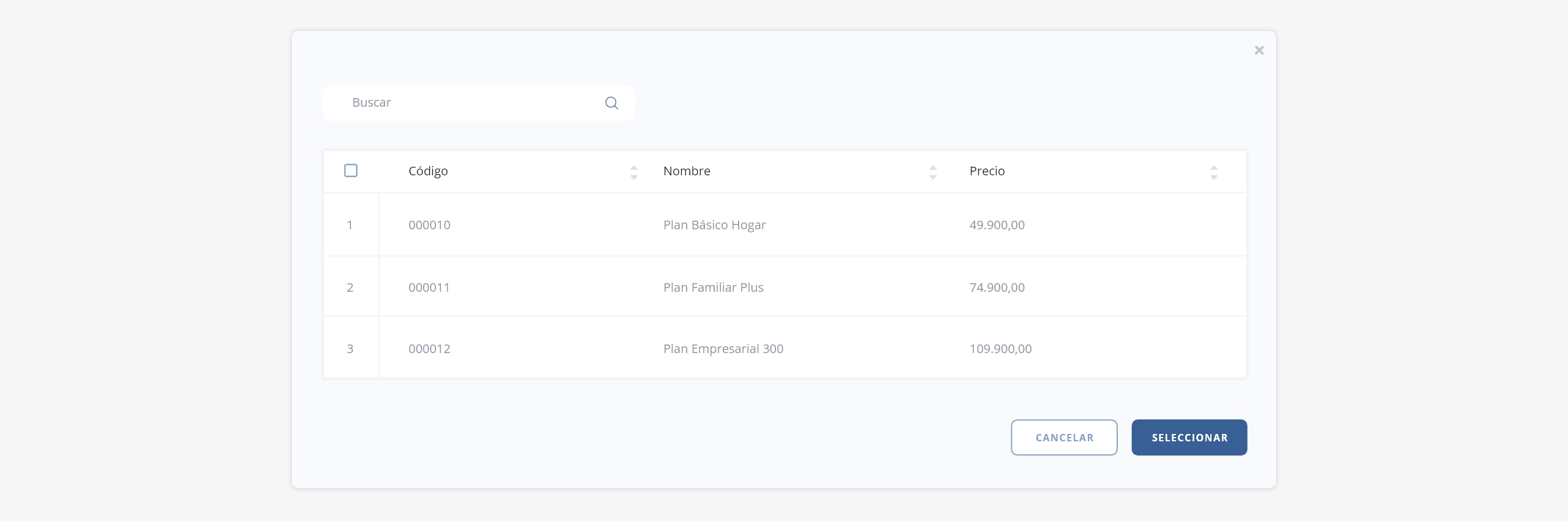 Una vez creados los productos en Sigma, deberás vincularlos desde ISPCube. Para eso, en los formularios de alta de planes, productos, equiepos y servicios dentro de ISPCube, vas a encontrar un campo llamado «Código», acompañado de un ícono de lupa. Desde ahí podrás seleccionar el producto correspondiente ya creado en Sigma. En el caso de los recargos y extras, estos códigos se configuran a través del apartado desarrollado en el punto 2.