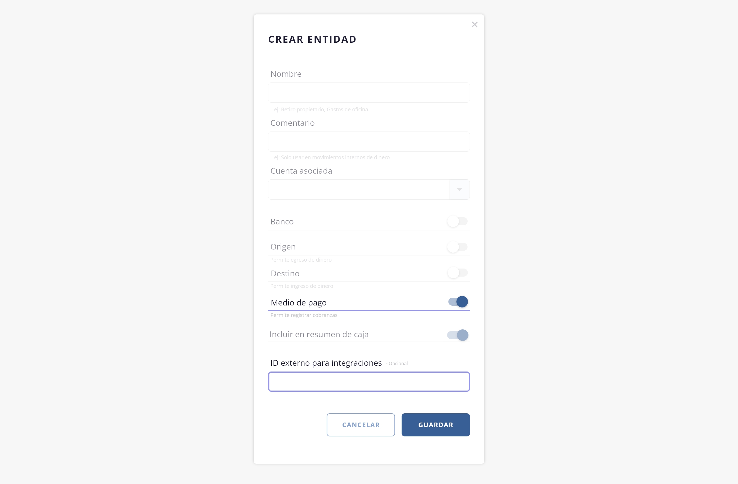 Una vez dentro de este apartado, haz click en el botón “+” en el sector de «Entidades» para configurar el medio de pago correspondiente. En el formulario que se abrirá, deberás completar un ID externo, que será utilizado para las integraciones con Sigma.