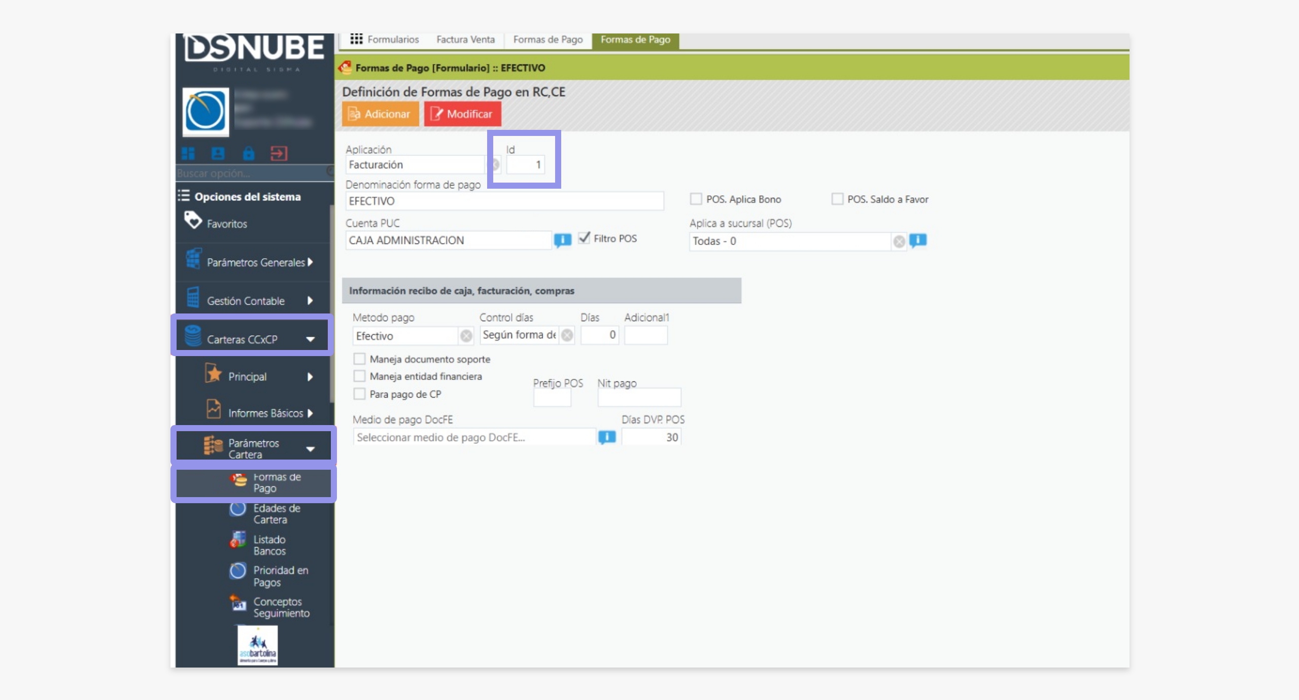 Nota. Cada ID se obtiene del menú Carteras CCxCP > Parámetros cartera > Formas de pago, dentro de Sigma: