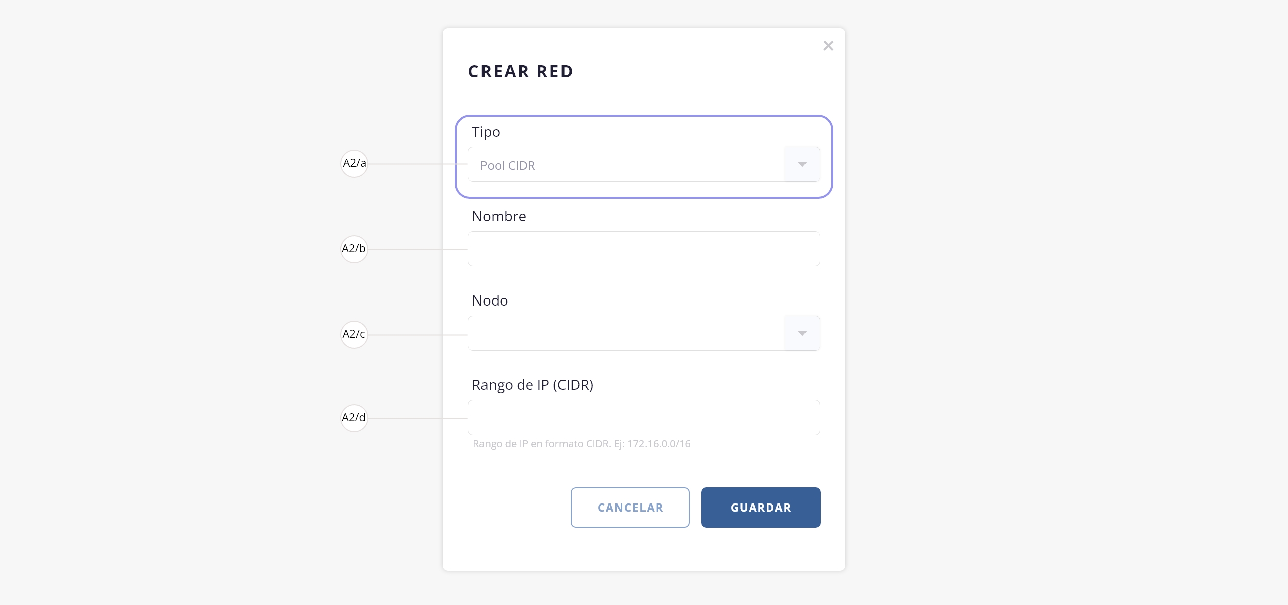 - a. Crear red. Permite añadir una nueva red. El formulario varía según el tipo de red seleccionada, te mostramos ambos a continuación: