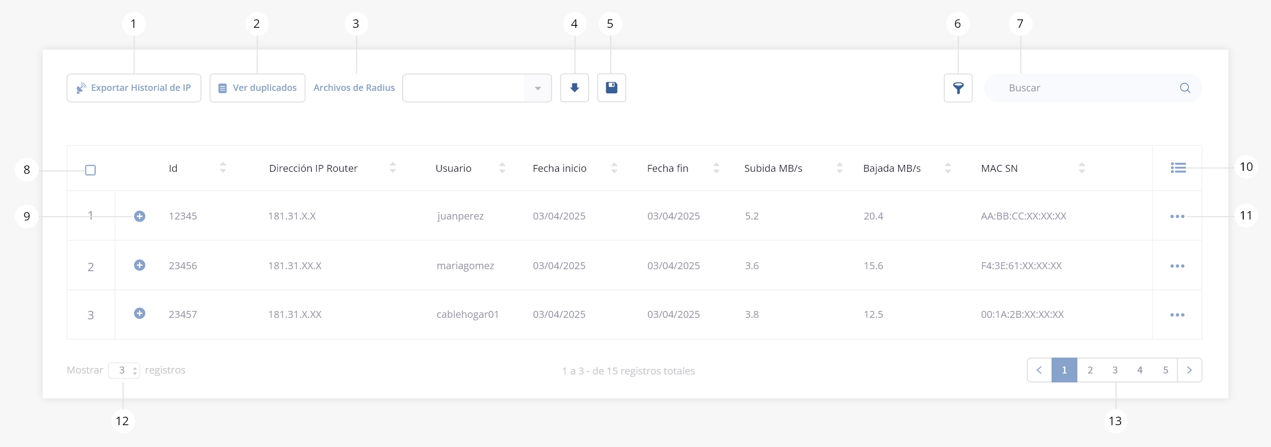 En esta sección podrás consultar la última sesión de navegación de cada usuario autenticado en Radius. Además, podrás exportar registros de historial por fecha, por dirección IP o por usuario.