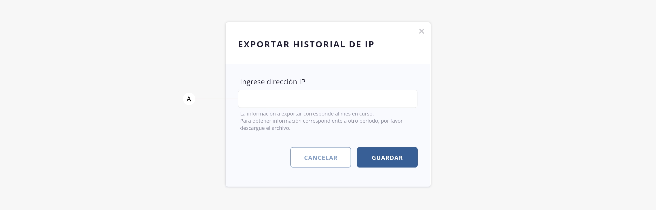 - a. Ingrese dirección IP. Ingresa la dirección IP sobre la que deseas consultar el historial. Al hacer click en «Guardar» podrás exportar el archivo en formato .csv.
