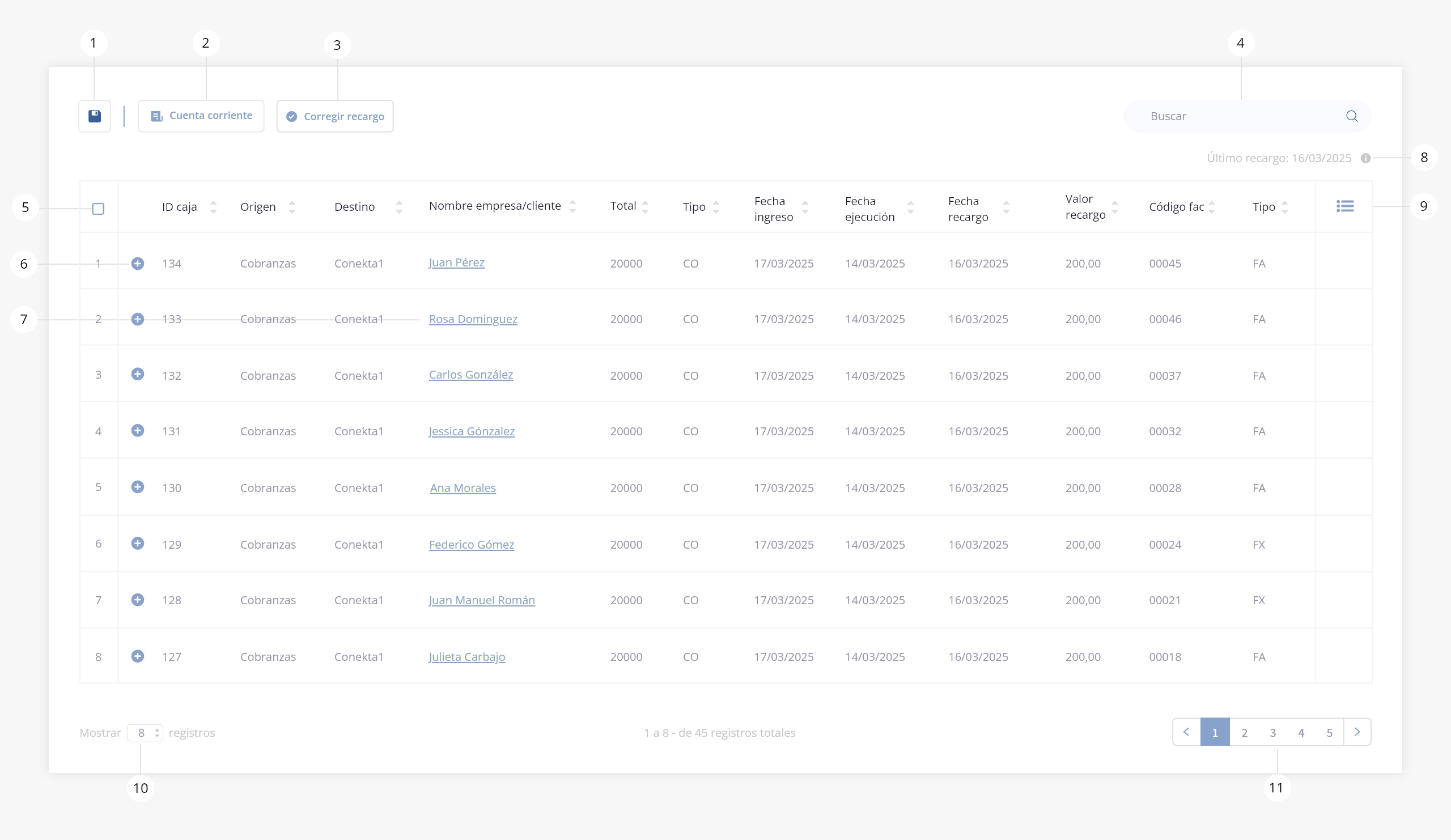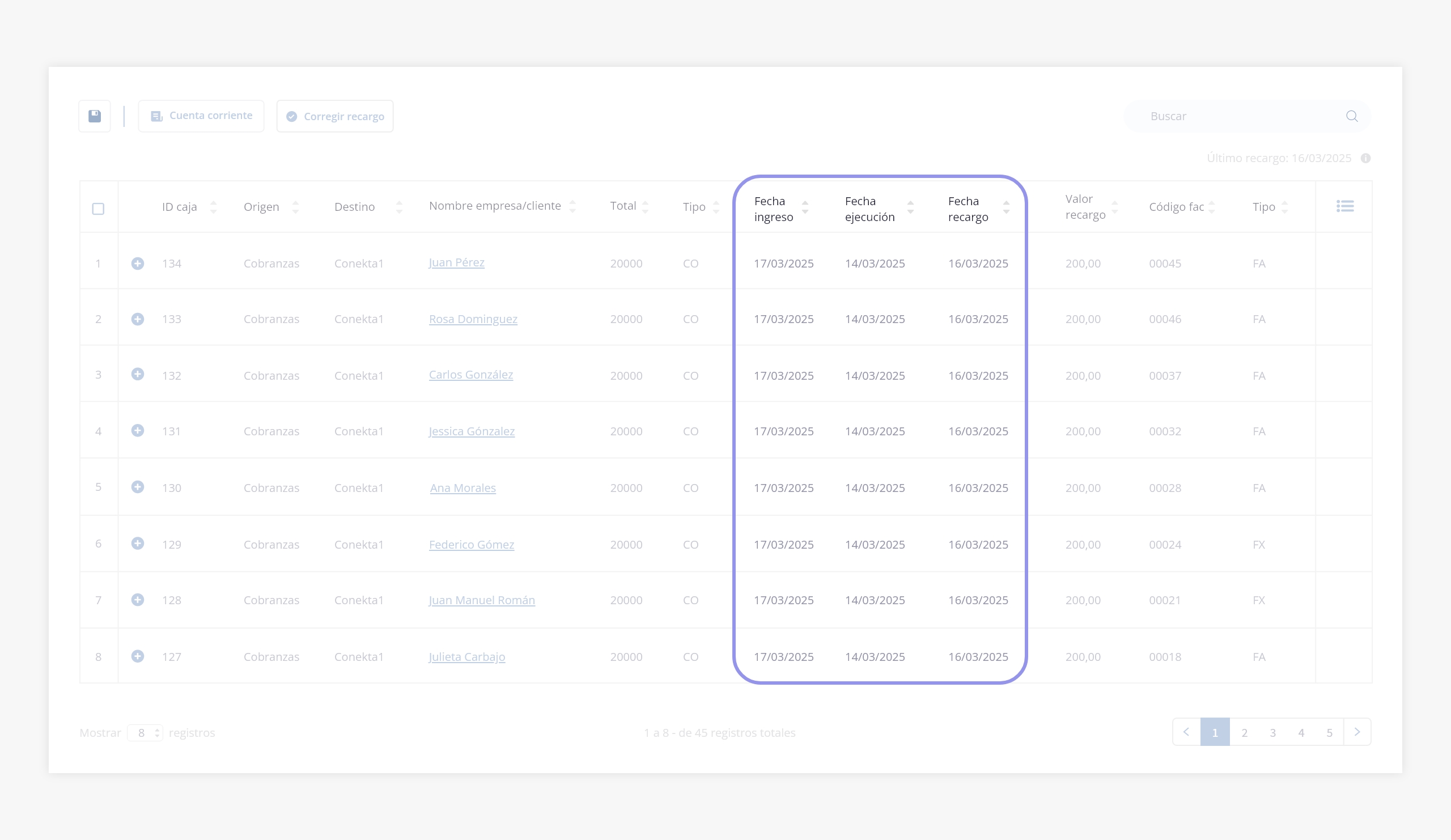 Al ingresar al módulo, si tenés pagos con recargos asociados, vas a ver un listado con los datos del pago (ID caja, origen, destino, nombre del cliente, total, tipo, fecha de ingreso y fecha de ejecución) junto con los datos del recargo (fecha, valor, código de factura y tipo de factura).
