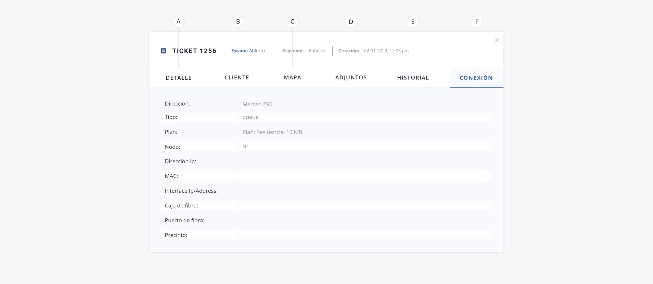 - a. Detalle. Aquí podrás visualizar el historial del ticket, así como la información básica de área, prioridad, categoría, visita, dirección, etc.