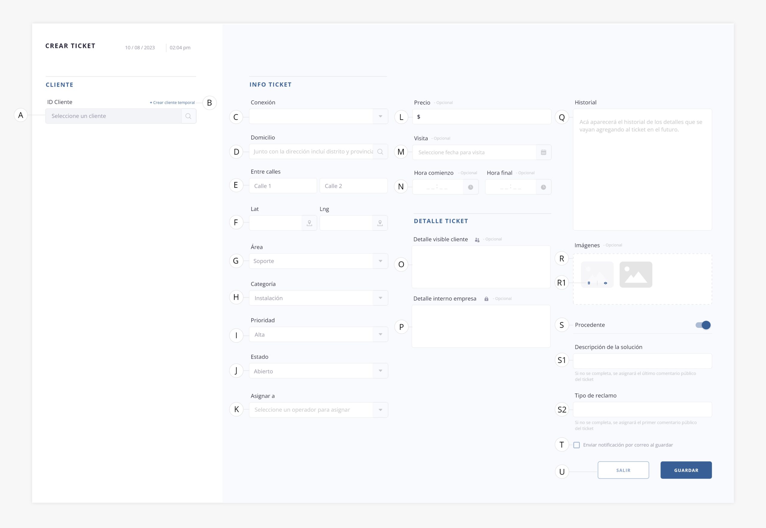 Al presionar este símbolo (+) se abrirá el siguiente formulario para crear un nuevo ticket: