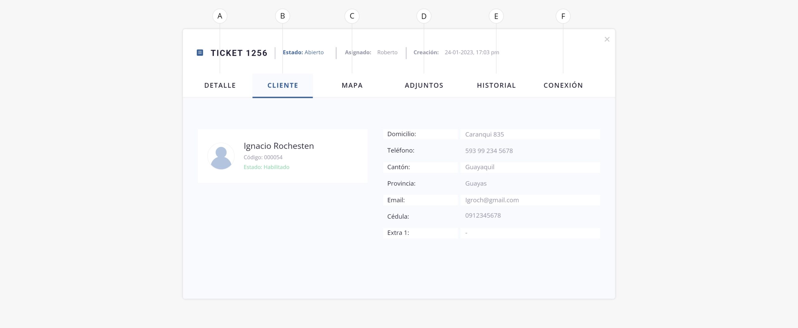- b. Cliente. Nos mostrará un resumen de los datos personales del cliente al cual se le ha cargado el ticket.