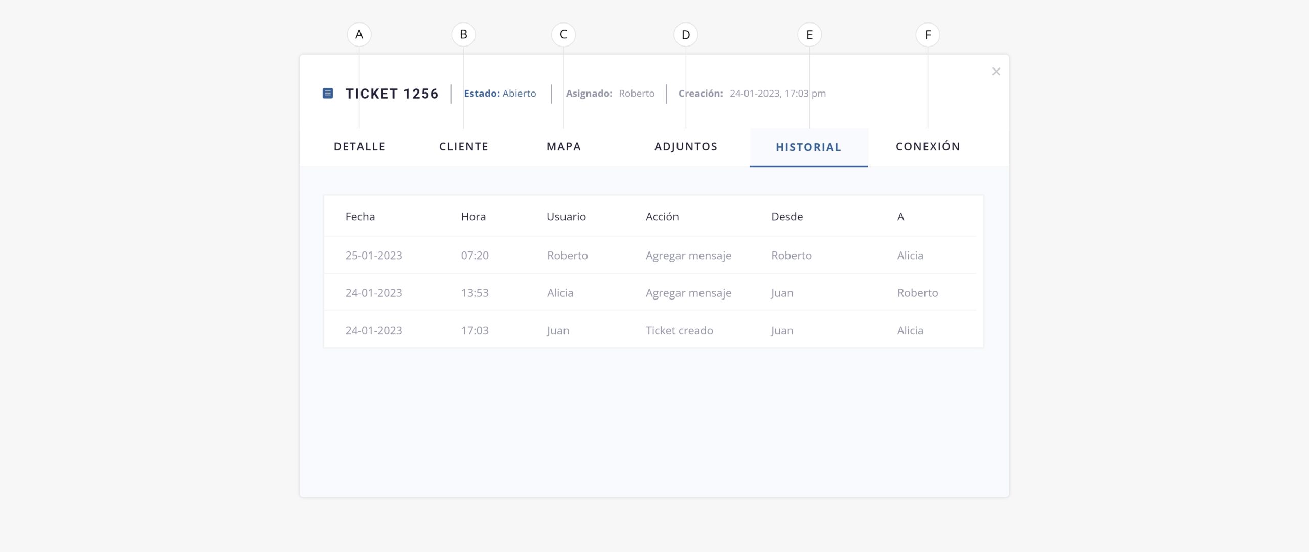 - e. Historial. Este apartado resume el historial del ticket, los movimientos realizados sobre el mismo, entre otros. El mismo nos traerá la fecha, hora, usuario que realiza la operación, la acción y desde donde hacia donde se realiza el movimiento de información.
