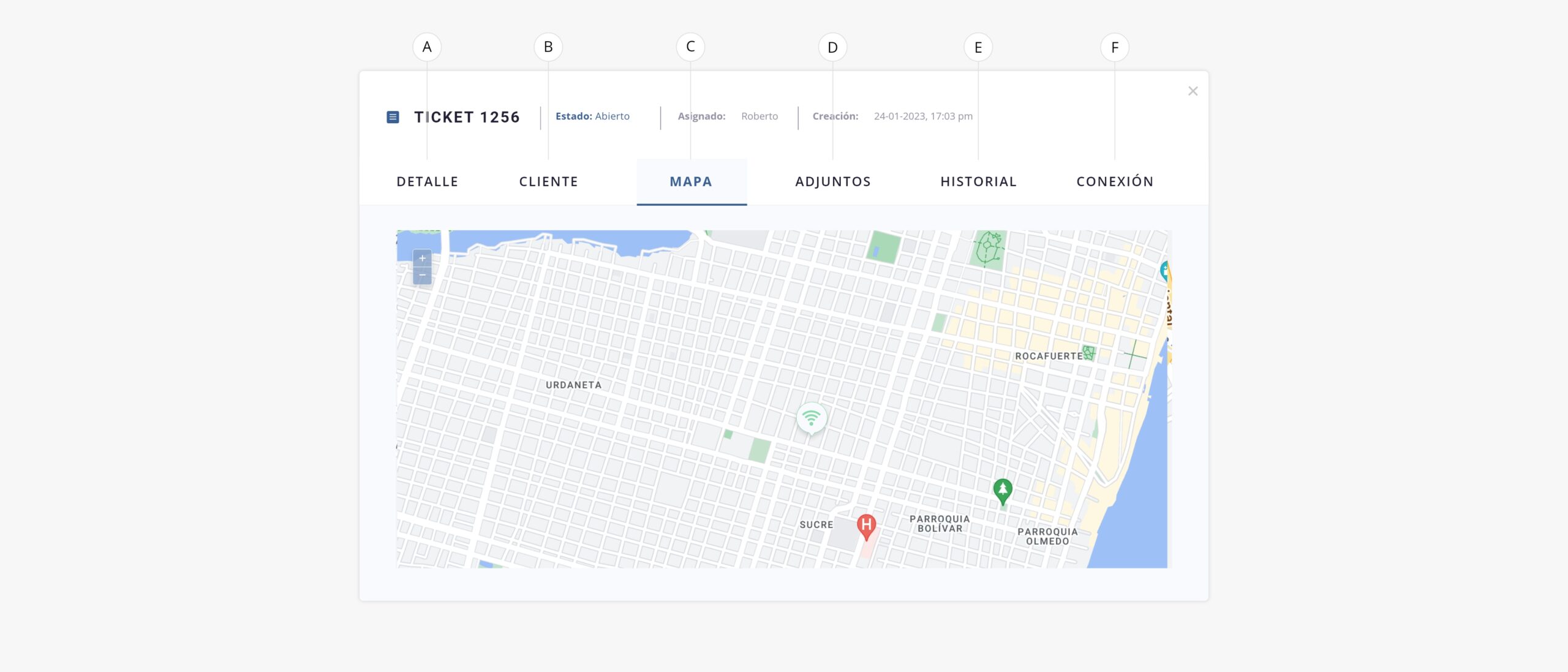 - c. Mapa. Nos permitirá la visualización de la locación donde esta asignado el ticket.
