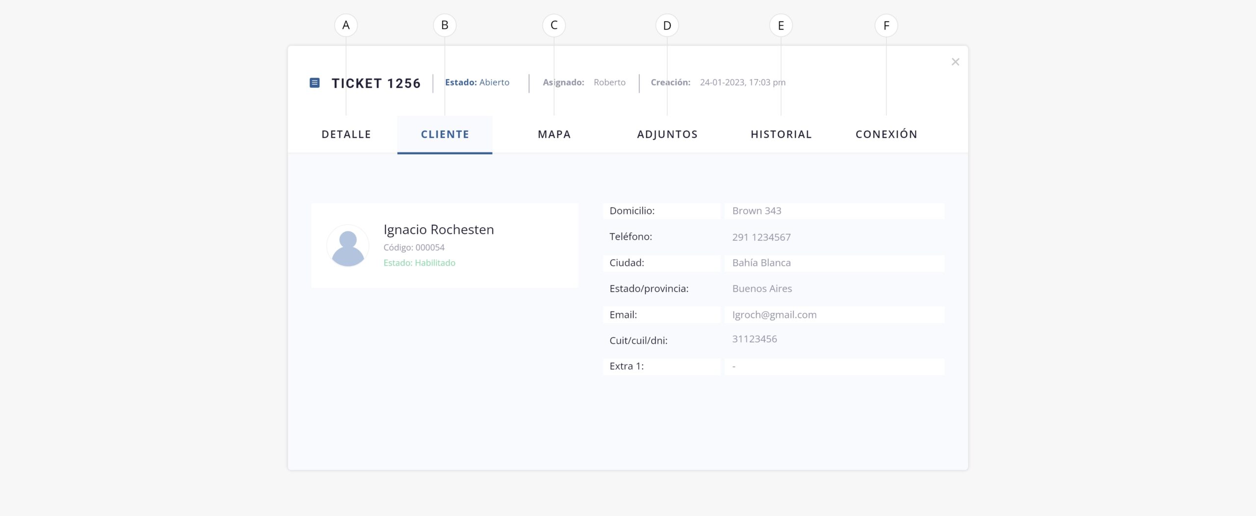 - c. Conexión. Podrás seleccionar entre las conexiones activas del cliente para asignarle un ticket a la misma.