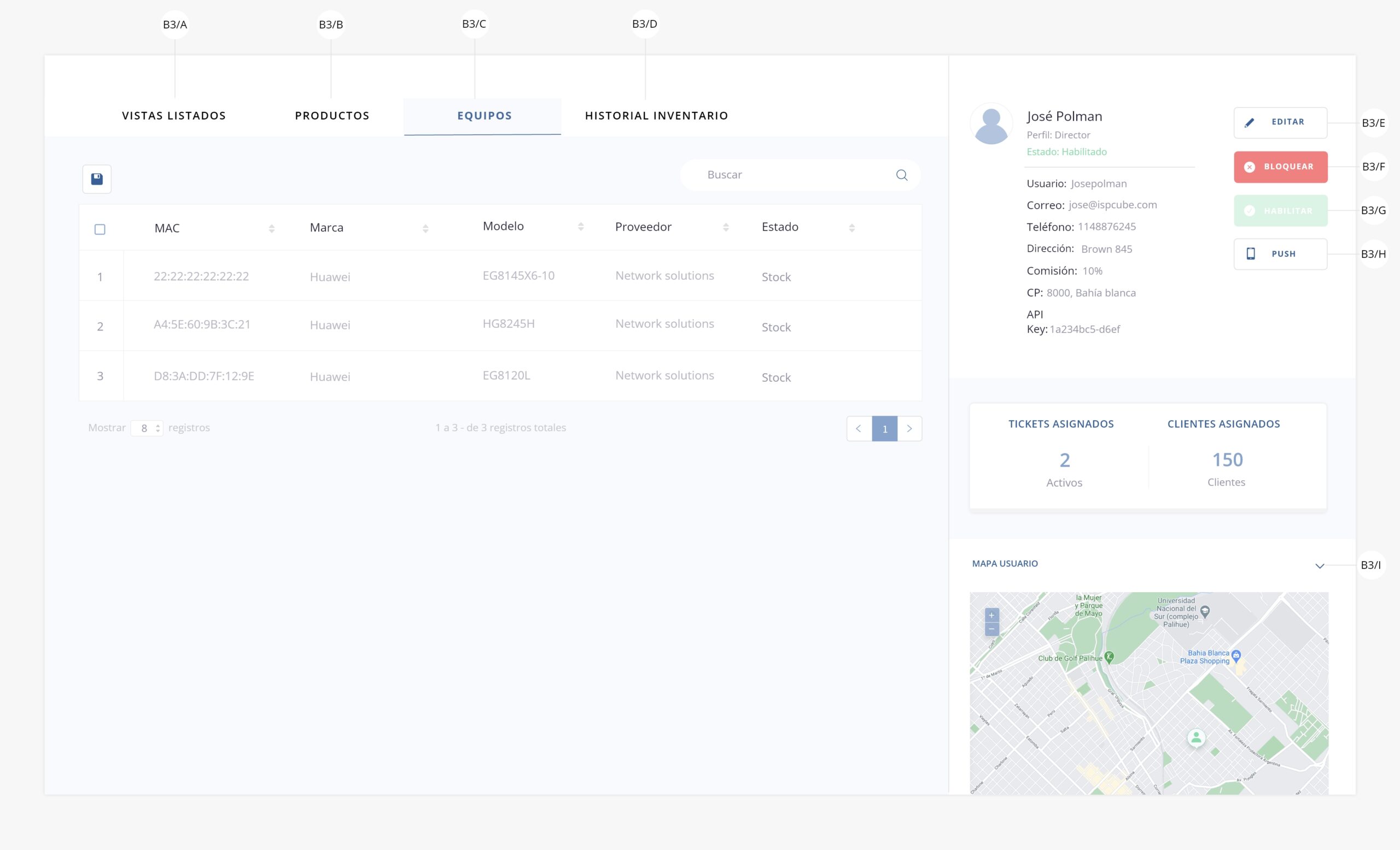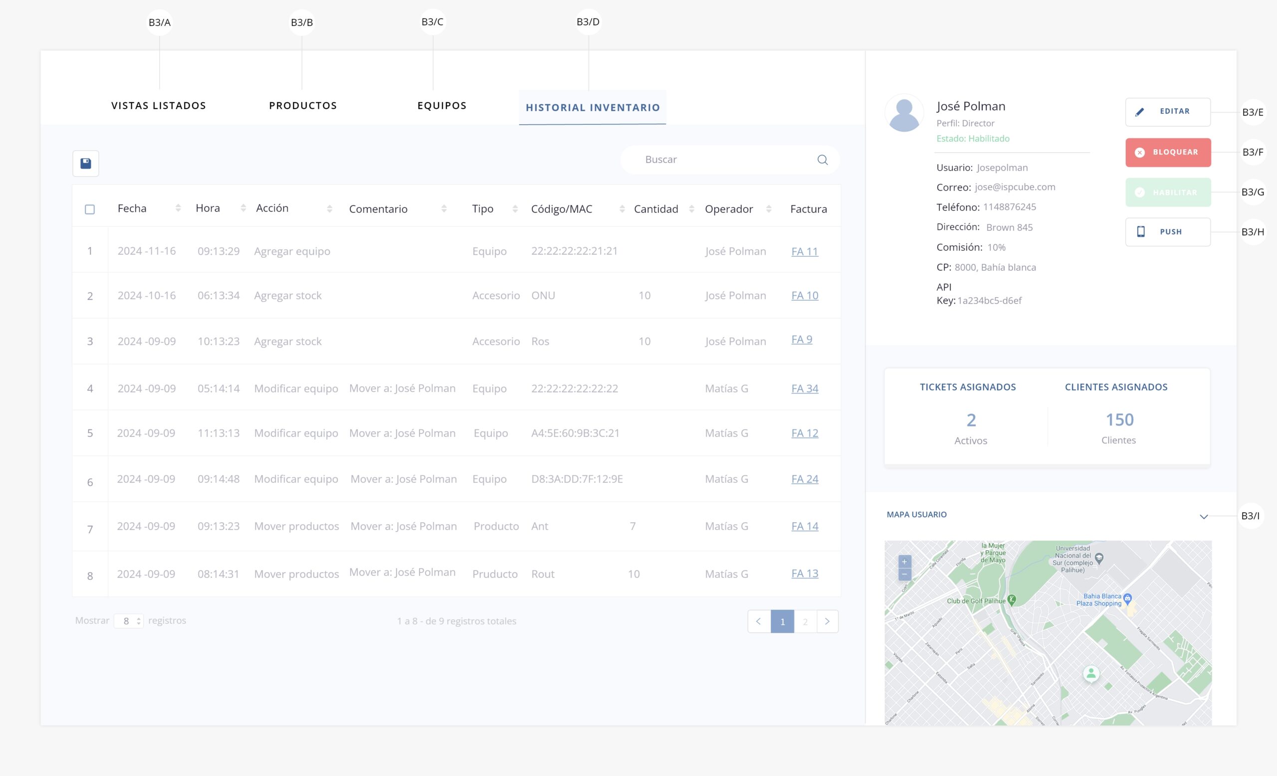 b3/i) Mapa usuario. Sobre este apartado podrás visualizar sobre un mapa la ubicación del usuario del sistema, siempre y cuando tengan la app de técnicos instalada.
