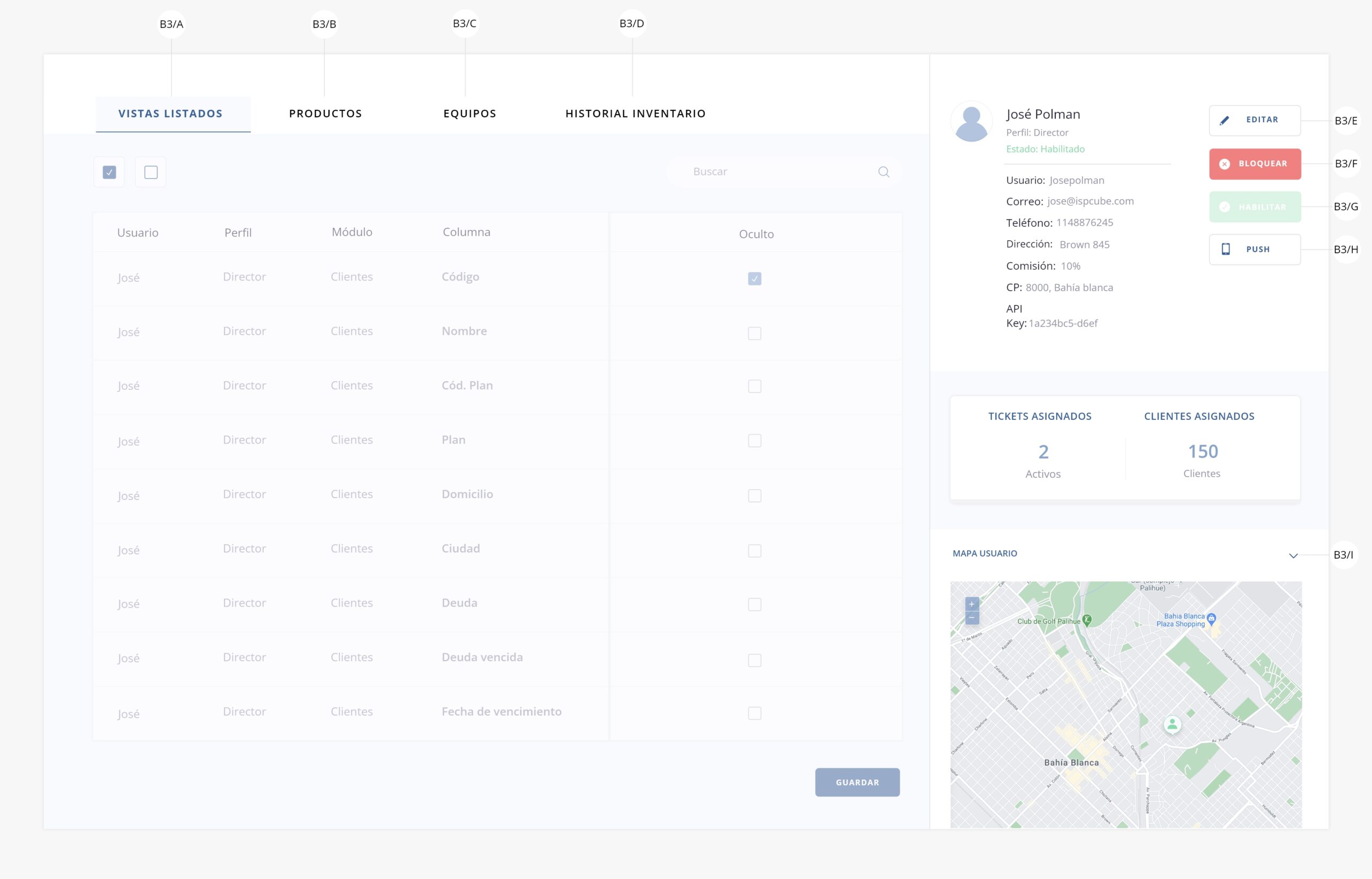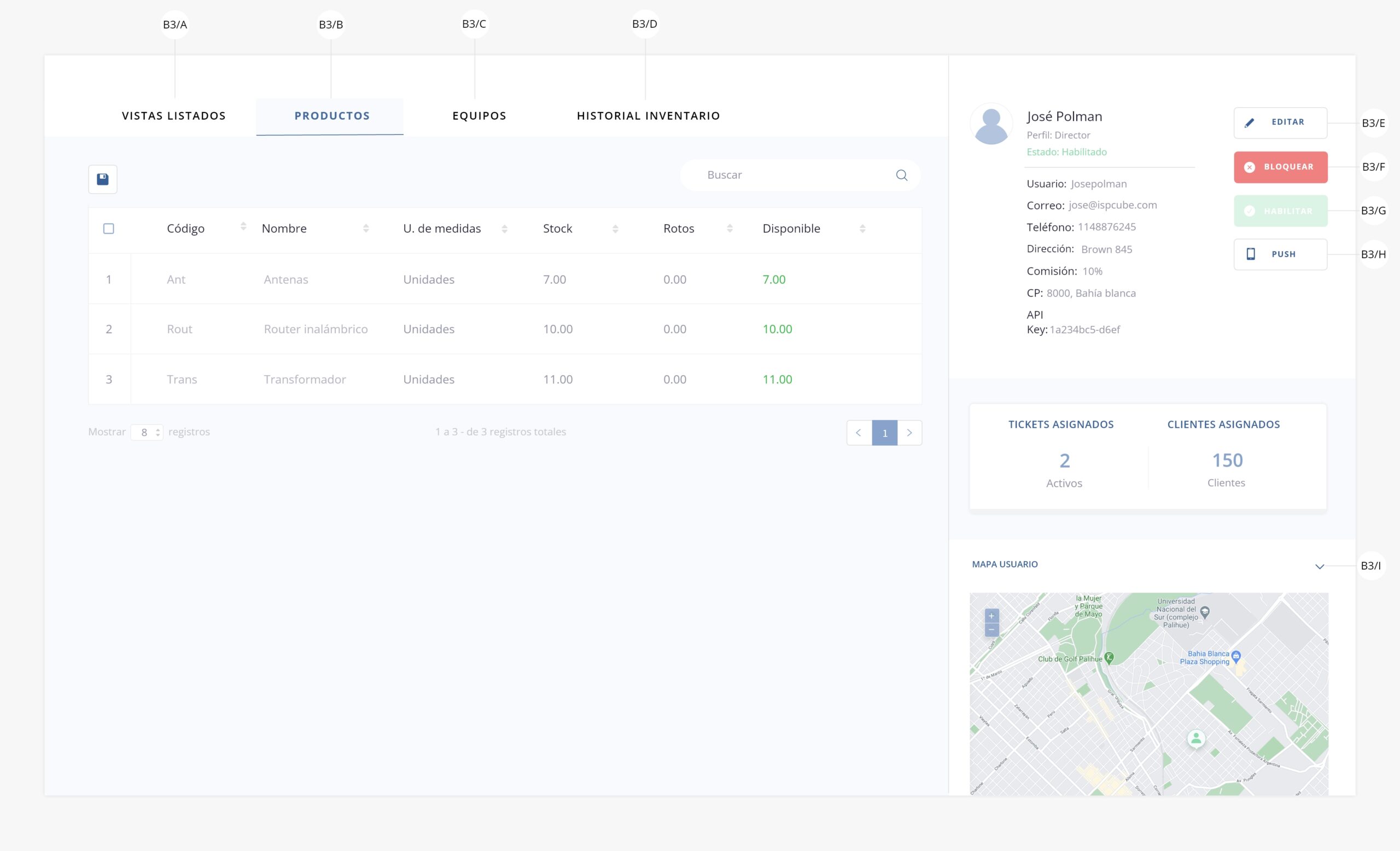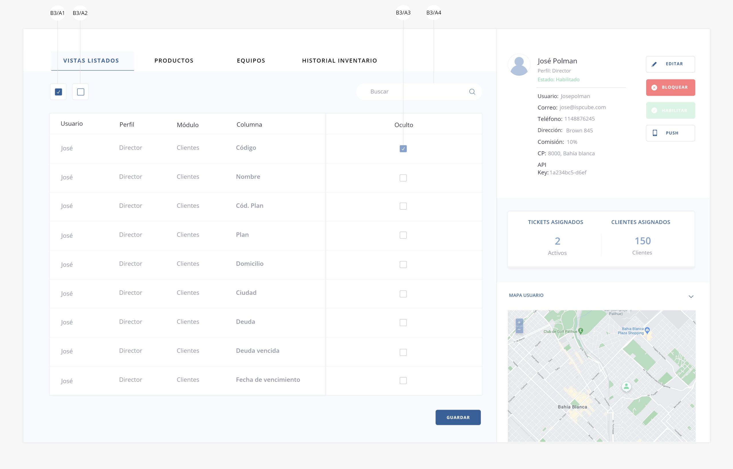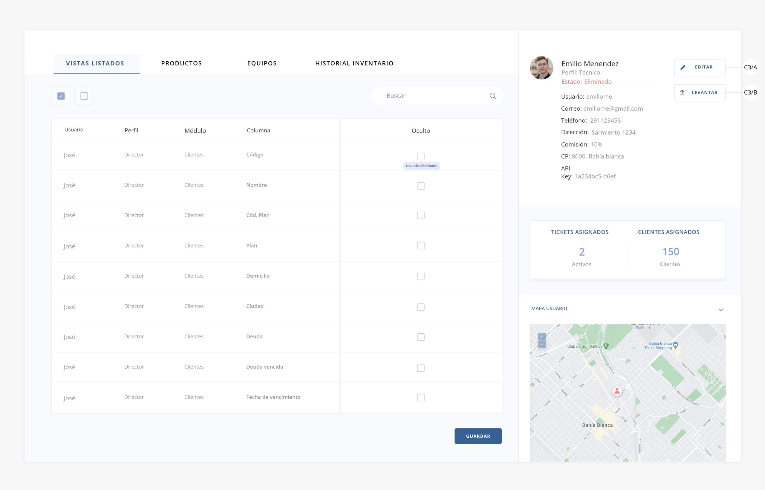 b3) Ver usuario. Permite acceder a la interna del usuario y gestionar tanto las vistas a las que tendrá acceso como los movimientos de inventario, siempre que tenga habilitada la asignación de equipos/productos.Nota: El escenario que se muestra a continuación, es uno en el que el usuario tiene habilitados los switchs a24 y a25 en su configuración avanzada, los cuales permiten la asignación de equipos y productos al mismo, es por eso que en la imagen se visualizan los tabs de «Productos», «Equipos» e «Historial de inventario» (b3/b, b3/c, b3/d).