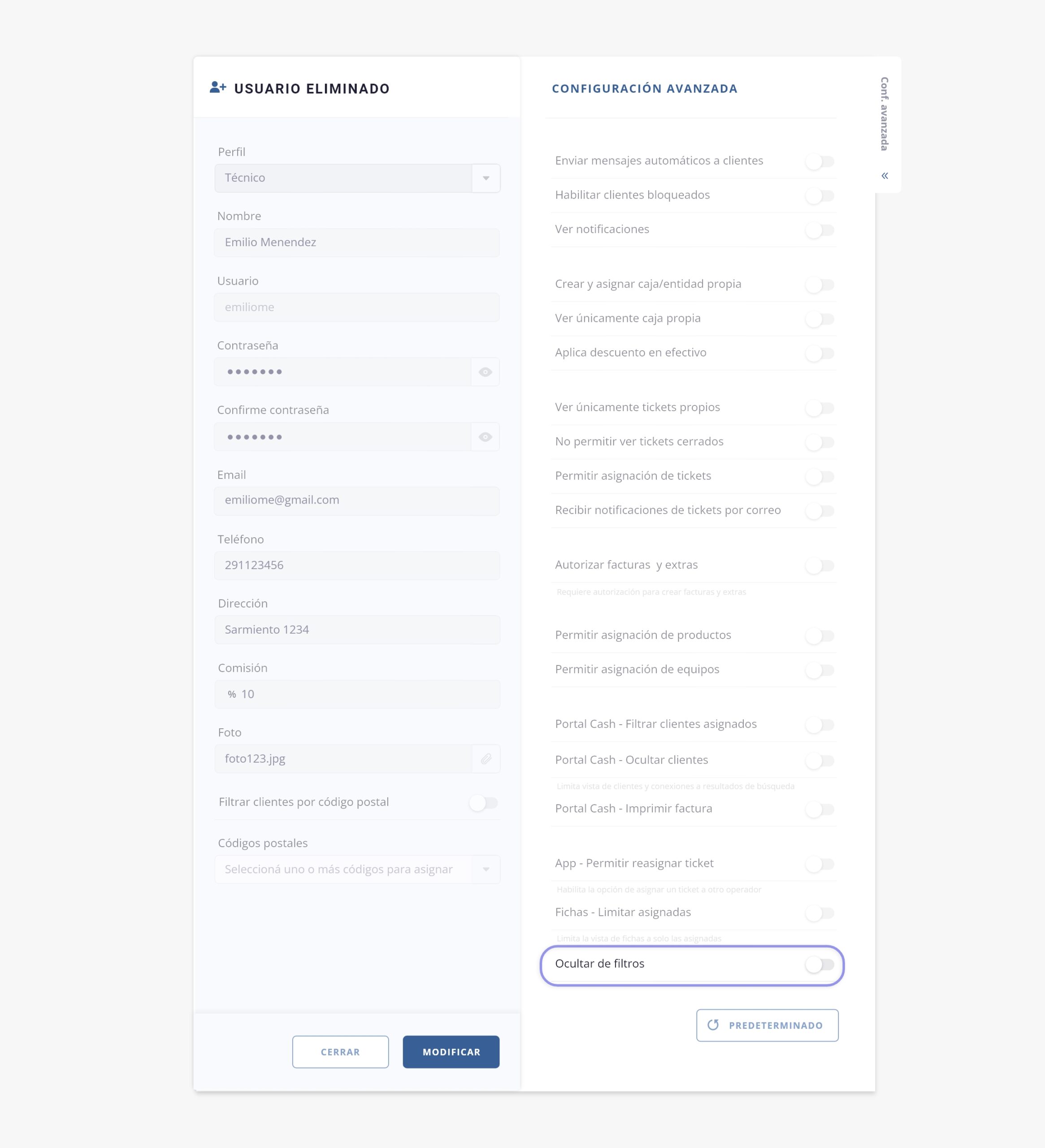 a31) Ocultar de filtros. Este switch permite definir si el usuario se mostrará o no dentro de los filtros de los listados del sistema.
