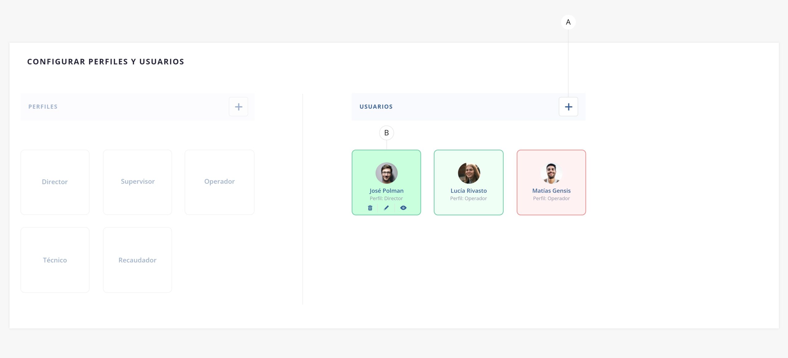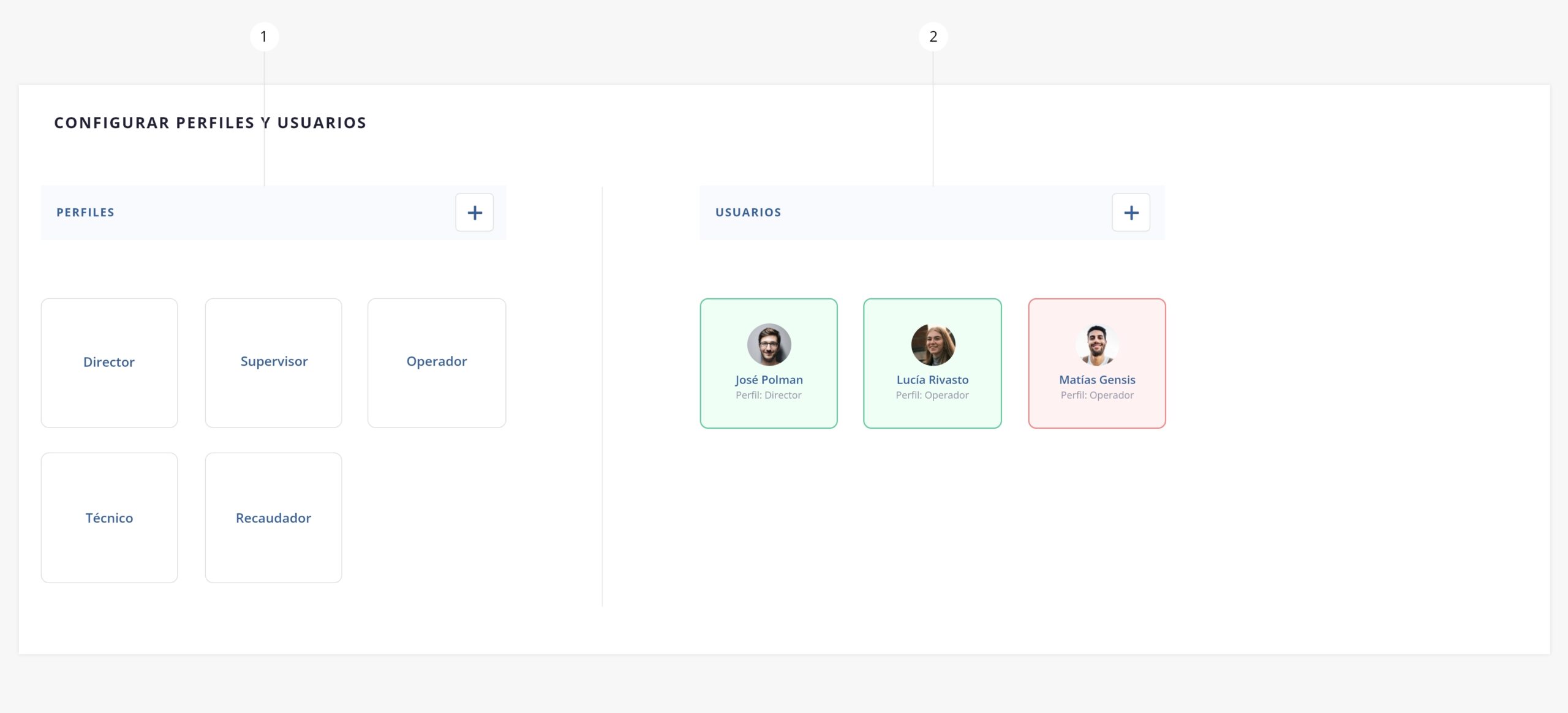Nota: en el panel de Configuración de Perfiles y Usuarios podrás visualizar el estado del usuario mediante una diferenciación de color: rojo cuando se encuentra bloqueado y verde cuando está habilitado.